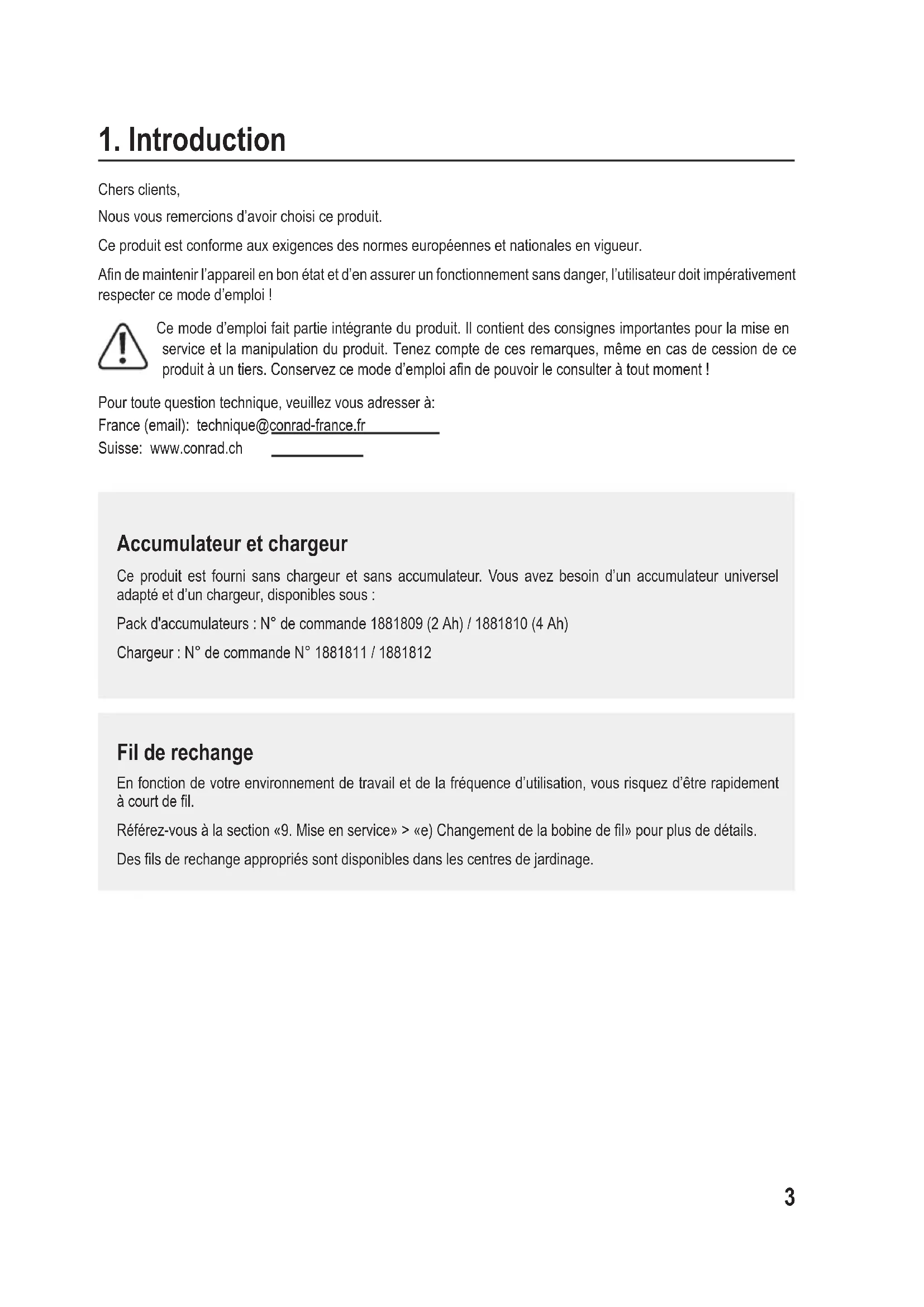 Chers clients, Nous vous remercions d’avoir choisi ce produit. Ce produit est conforme aux exigences des normes européennes et nationales en vigueur. Andemaintenirl’appareilenbonétatetd’enassurerunfonctionnementsansdanger,l’utilisateurdoitimpérativement respecter ce mode d’emploi ! Ce mode d’emploi fait partie intégrante du produit. Il contient des consignes importantes pour la mise en service et la manipulation du produit. Tenez compte de ces remarques, même en cas de cession de ce produitàuntiers.Conservezcemoded’emploiandepouvoirleconsulteràtoutmoment! Pour toute question technique, veuillez vous adresser à: France (email): technique@conrad-france.fr Suisse: www.conrad.ch 1Accumulateur et chargeur Ce produit est fourni sans chargeur et sans accumulateur. Vous avez besoin d’un accumulateur universel adapté et d’un chargeur, disponibles sous : Pack d'accumulateurs : N° de commande 1881809 (2 Ah) / 1881810 (4 Ah) Chargeur : N° de commande N° 1881811 / 1881812 2Fil de rechange En fonction de votre environnement de travail et de la fréquence d’utilisation, vous risquez d’être rapidement àcourtdel. Référez-vousàlasection«9.Miseenservice»>«e)Changementdelabobinedel»pourplusdedétails. Deslsderechangeappropriéssontdisponiblesdanslescentresdejardinage.4