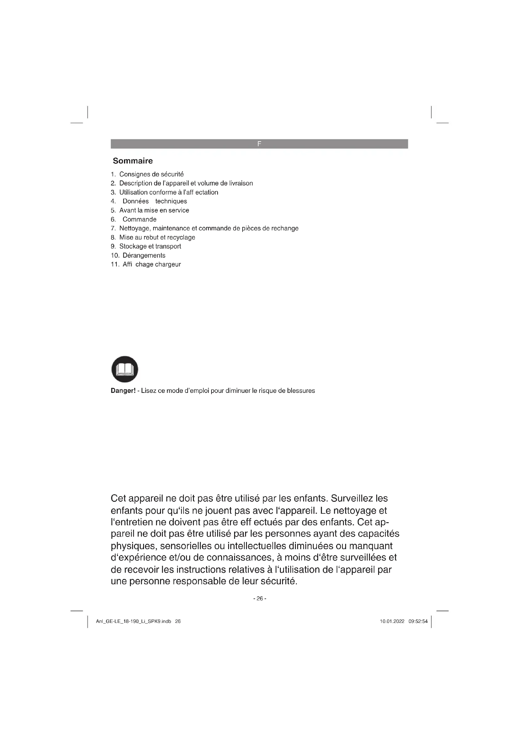 Danger! - Lisez ce mode d’emploi pour diminuer le risque de blessures Cet appareil ne doit pas être utilisé par les enfants. Surveillez les enfants pour qu‘ils ne jouent pas avec l‘appareil. Le nettoyage et l‘entretien ne doivent pas être eff ectués par des enfants. Cet ap- pareil ne doit pas être utilisé par les personnes ayant des capacités physiques, sensorielles ou intellectuelles diminuées ou manquant d‘expérience et/ou de connaissances, à moins d‘être surveillées et de recevoir les instructions relatives à l‘utilisation de l‘appareil par une personne responsable de leur sécurité. Anl_GE-LE_18-190_Li_SPK9.indb 26Anl_GE-LE_18-190_Li_SPK9.indb 26 10.01.2022 09:52:5410.01.2022 09:52:54F