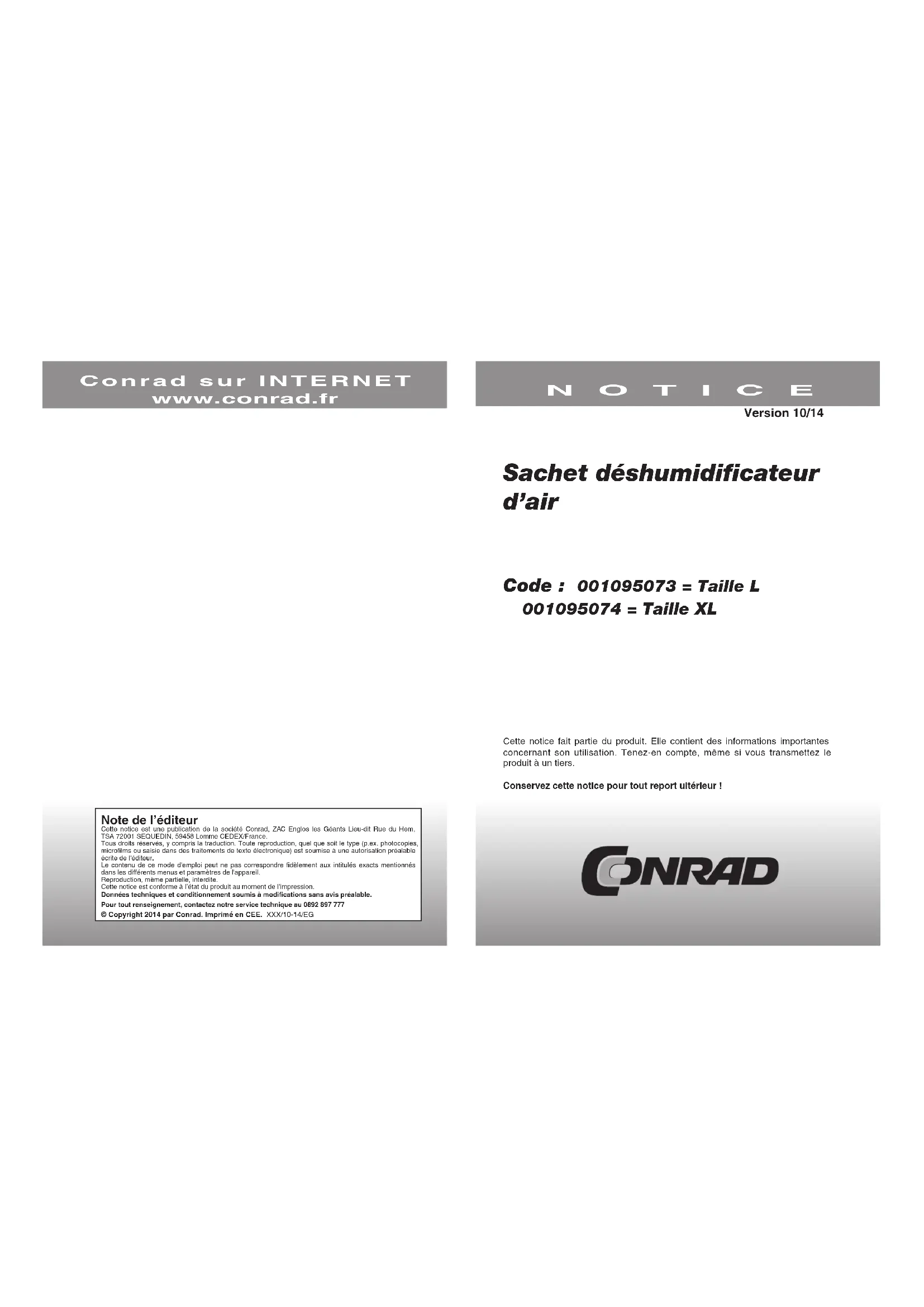 Sachet déshumidificateur d’air Code : 001095073 = Taille L 001095074 = Taille XL Cette notice fait partie du produit. Elle contient des informations importantes concernant son utilisation. Tenez-en compte, même si vous transmettez le produit à un tiers.Conservez cette notice pour tout report ultérieur ! NOTICE Conrad sur INTERNET www.conrad.fr Version 10/14 Note de l’éditeur Cette notice est une publication de la société Conrad, ZAC Englos les Géants Lieu-dit Rue du Hem, TSA 72001 SEQUEDIN, 59458 Lomme CEDEX/France.Tous droits réservés, y compris la traduction. Toute reproduction, quel que soit le type (p.ex. photocopies, microfilms ou saisie dans des traitements de texte électronique) est soumise à une autorisation préalable écrite de l’éditeur.Le contenu de ce mode d'emploi peut ne pas correspondre fidèlement aux intitulés exacts mentionnés dans les différents menus et paramètres de l'appareil.Reproduction, même partielle, interdite.Cette notice est conforme à l’état du produit au moment de l’impression.Données techniques et conditionnement soumis à modifications sans avis préalable.Pour tout renseignement, contactez notre service technique au 0892 897 777 © Copyright 2014 par Conrad. Imprimé en CEE. XXX/10-14/EG2 3 Utilisation Votre déshumidificateur vous permet de combattre l’humidité présente au sein de votre véhicule, camping-car ou bateau. Ce produit attire l’humidité ambiante pour l’emmagasiner en toute sécurité. Un rechargement rapide dans le micro-onde Une fois que le produit a absorbé assez d’humidité, l’indicateur spécial change de couleur. Lorsque celui-ci vire du bleu clair au rose clair, une recharge rapide est recommandée. Placez le sachet sur une assiette adaptée à l’utilisation du four à micro-ondes accompagné d’un papier essuie-tout, puis faites la passer au micro-onde durant 4 minutes à une puissance de 600 W. Assurez vous que l’indicateur soit bien dirigé vers le haut. Vous avez également la possibilité de recharger le Pingi en l’exposant au soleil ou sur un radiateur : cette méthode nécessite toutefois plus de temps. Une fois le rechargement terminé, l’indicateur coloré redevient bleu et le déshumidificateur est de nouveau prêt à l’emploi. - Avant la première utilisation, retirer le sachet plastique. - Ce produit n’est pas un jouet et doit rester hors de portée des enfants. - Evitez d’endommager l’indicateur coloré (rayures, p.ex.) - Il est possible que l’indicateur de couleur soit modifié après plusieurs cycles de charge, en fonction du niveau d’aération de votre micro-onde. Cela n’a aucun effet sur l’efficacité du produit. Consignes de sécurité relatives à l’utilisation du four à micro-ondes