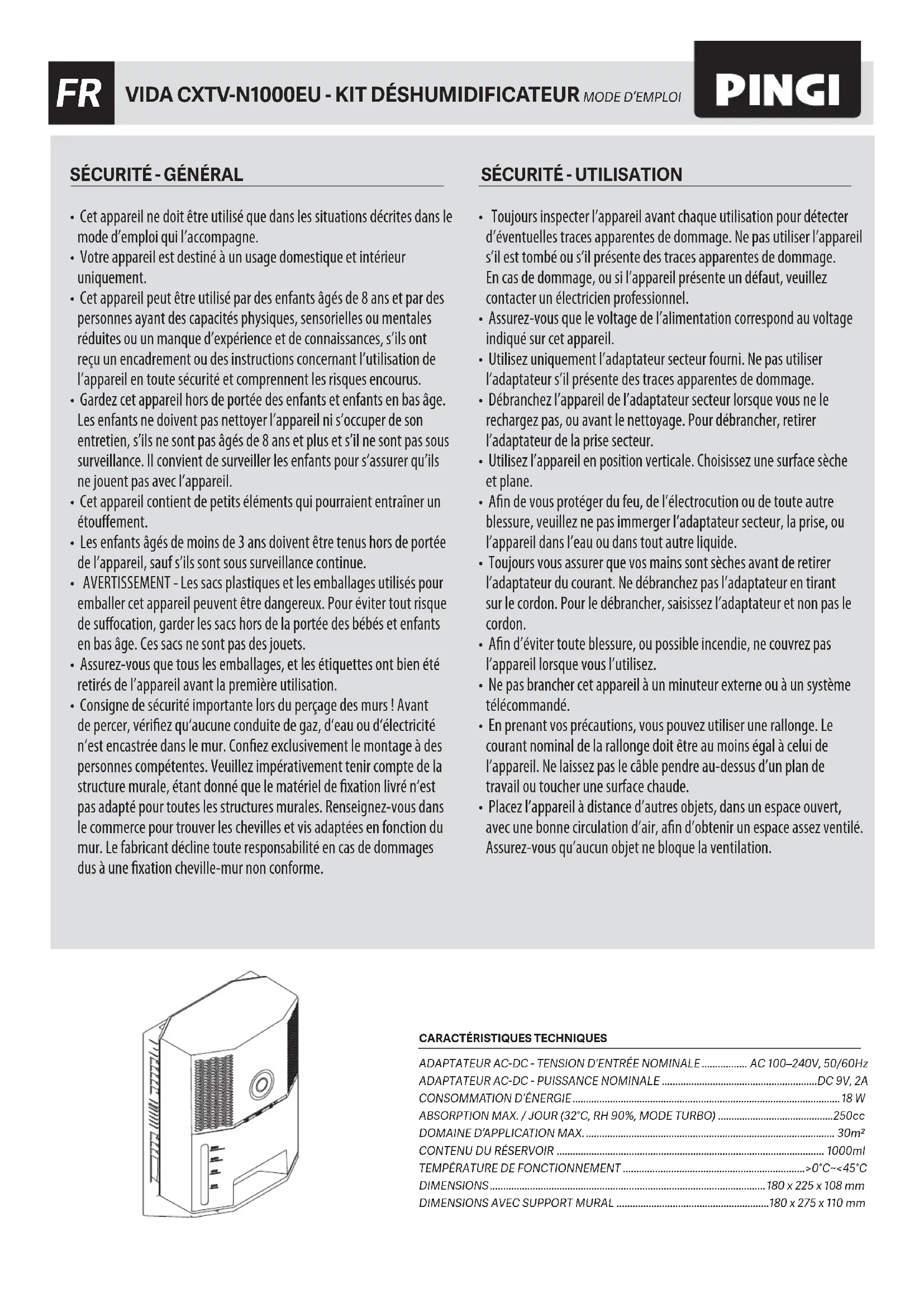 CXTV-N1000EU - VIDA FR (2020)_v2.indd 3 06-11-20(W45) 16:09CONDITIONS D’UTILISATIONVotre nouveau kit déshumidificateur Pingi Vida (CXTV-N1000EU) est idéal pour déshumidifier les espaces intérieurs clos. L’appareil est alimenté par l’adaptateur 9V AC-DC qui est fourni avec le dispositif. L’adaptateur électrique fonctionne sur du 100-240V, 50/60Hz (alimentation électrique). Vous ne devez jamais essayer de relier l’appareil ou l’adaptateur à d’autres sources d’énergie. Veuillez respecter les consignes de sécurité qui sont incluses dans ce mode d’emploi. Conservez ce mode d’emploi dans un endroit sûr, afin de pouvoir le consulter quand vous le souhaitez. Ce produit respecte les exigences règlementaires nationales et européennes. Vous ne devez jamais tenter d’effectuer des modifications techniques sur cet appareil. Nous ne pourrons pas être tenus pour responsables des accidents ou des dégâts causés par le non-respect des consignes de sécurité et du mode d’emploi.FONCTIONNEMENT ET APPLICATIONLe Pingi CXTV-N1000EU est un kit déshumidificateur qui a été conçu pour réguler l’humidité excessive dans les espaces intérieurs. Ce produit est idéal pour les espaces intérieurs non-ventilés. L’humidité est recueillie à l’intérieur du réservoir intégré.À QUOI S’ATTENDRELe Vida 2 est un déshumidificateur thermoélectrique. Sa performance dépend de la quantité d’eau dans l’air. Plus la température ambiante est élevée, plus l’air peut contenir d’eau (humidité relative). À des températures ambiantes élevées, l’appareil doit travailler beaucoup plus dur afin de réduire le niveau d’humidité relative. Le Vida 2 collectera alors jusqu’à 250 ml d’eau par jour, et vous devrez souvent vider le réservoir d’eau. Dans une pièce plus fraîche, il y aura moins d’eau à capturer et le réservoir se remplira plus lentement. La température ambiante est-elle <10 ° C? Il n’y aura donc pas beaucoup d’humidité dans l’air et le réservoir se remplira très lentement.AVANT D’UTILISER CET APPAREILVeuillez lire attentivement les consignes de sécurité qui figurent sur la page avant de ce mode d’emploi avant de commencer. INSTALLATION DU SUPPORT MURALCe kit inclut un support mural, de modèle VSB-1S. L’utilisation du support mural est facultative – vous pouvez utiliser cet appareil sans ce support.Pour utiliser le support mural, vous devez soigneusement le fixer sur une surface verticale à l’aide de 3 vis.1. Choisissez une surface verticale qui permet d’espacer suffisamment le support mural des objets environnants.