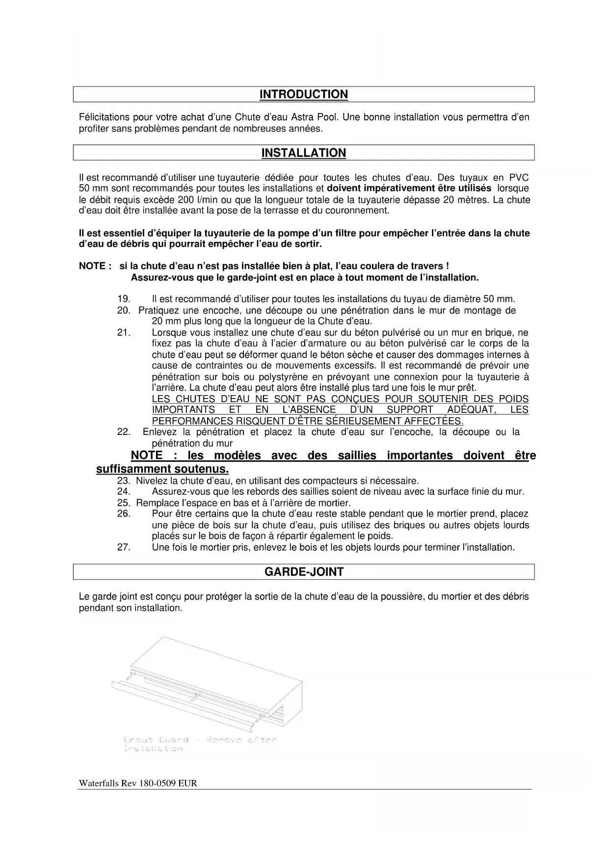 Félicitations pour votre achat d'une Chute d'eau Astra Pool. Une belle installation vous permettra d'en profiter sans problèmes pendant de nombreuses années.