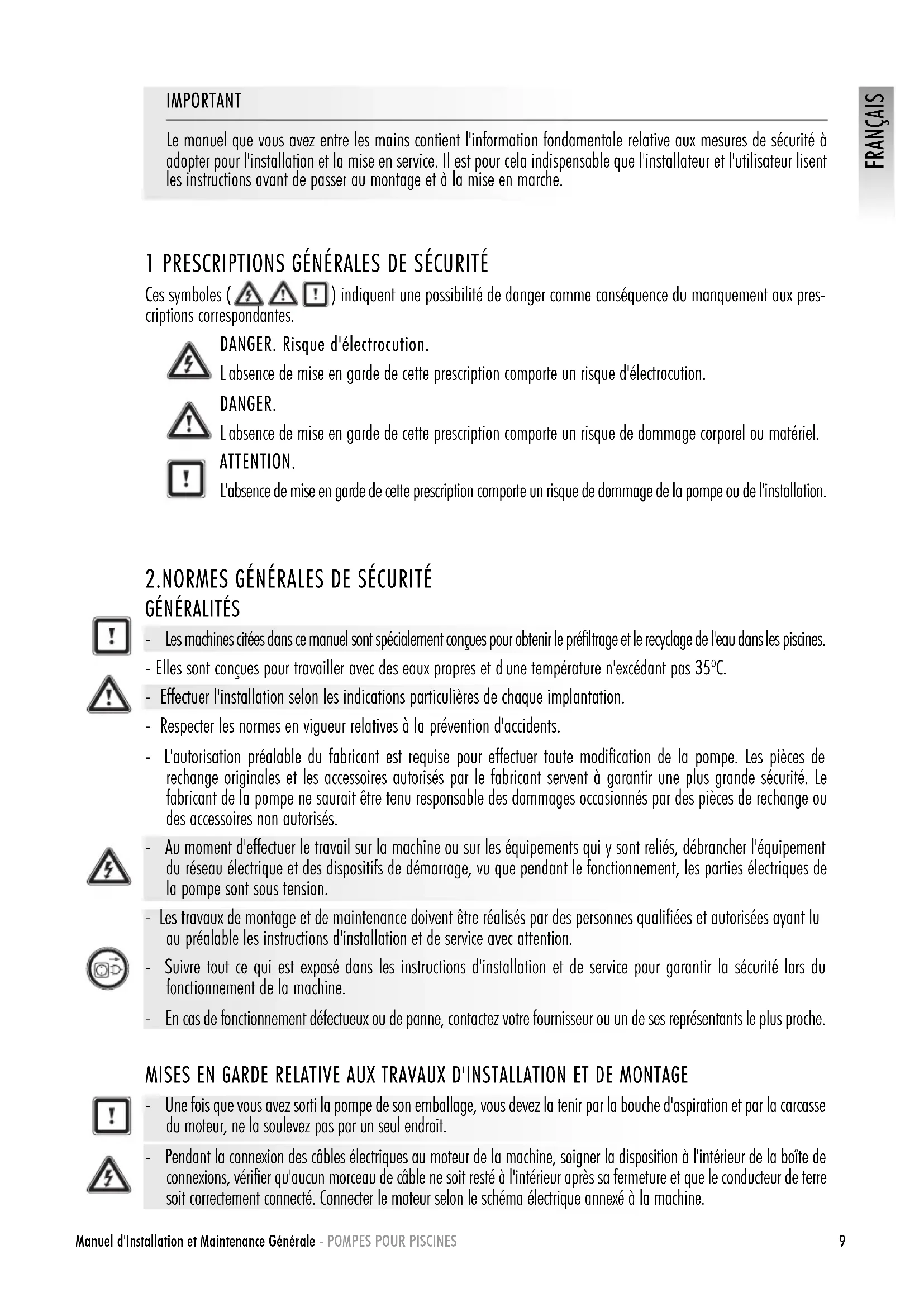 Incorrect terminal box connections Tighten the cable correctly to the terminal / Adapt the size of the cable connection to the terminal boxFRANÇAIS Manuel d'Installation et Maintenance Générale - POMPES POUR PISCINES 9 IMPORTANT Le manuel que vous avez entre les mains contient l'information fondamentale relative aux mesures de sécurité à adopter pour l'installation et la mise en service. Il est pour cela indispensable que l'installateur et l'utilisateur lisent les instructions avant de passer au montage et à la mise en marche. 1 PRESCRIPTIONS GÉNÉRALES DE SÉCURITÉ Ces symboles ( ) indiquent une possibilité de danger comme conséquence du manquement aux pres- criptions correspondantes. DANGER. Risque d'électrocution. L'absence de mise en garde de cette prescription comporte un risque d'électrocution. DANGER. L'absence de mise en garde de cette prescription comporte un risque de dommage corporel ou matériel. ATTENTION. L'absence de mise en garde de cette prescription comporte un risque de dommage de la pompe ou de l'installation. 2.NORMES GÉNÉRALES DE SÉCURITÉ
