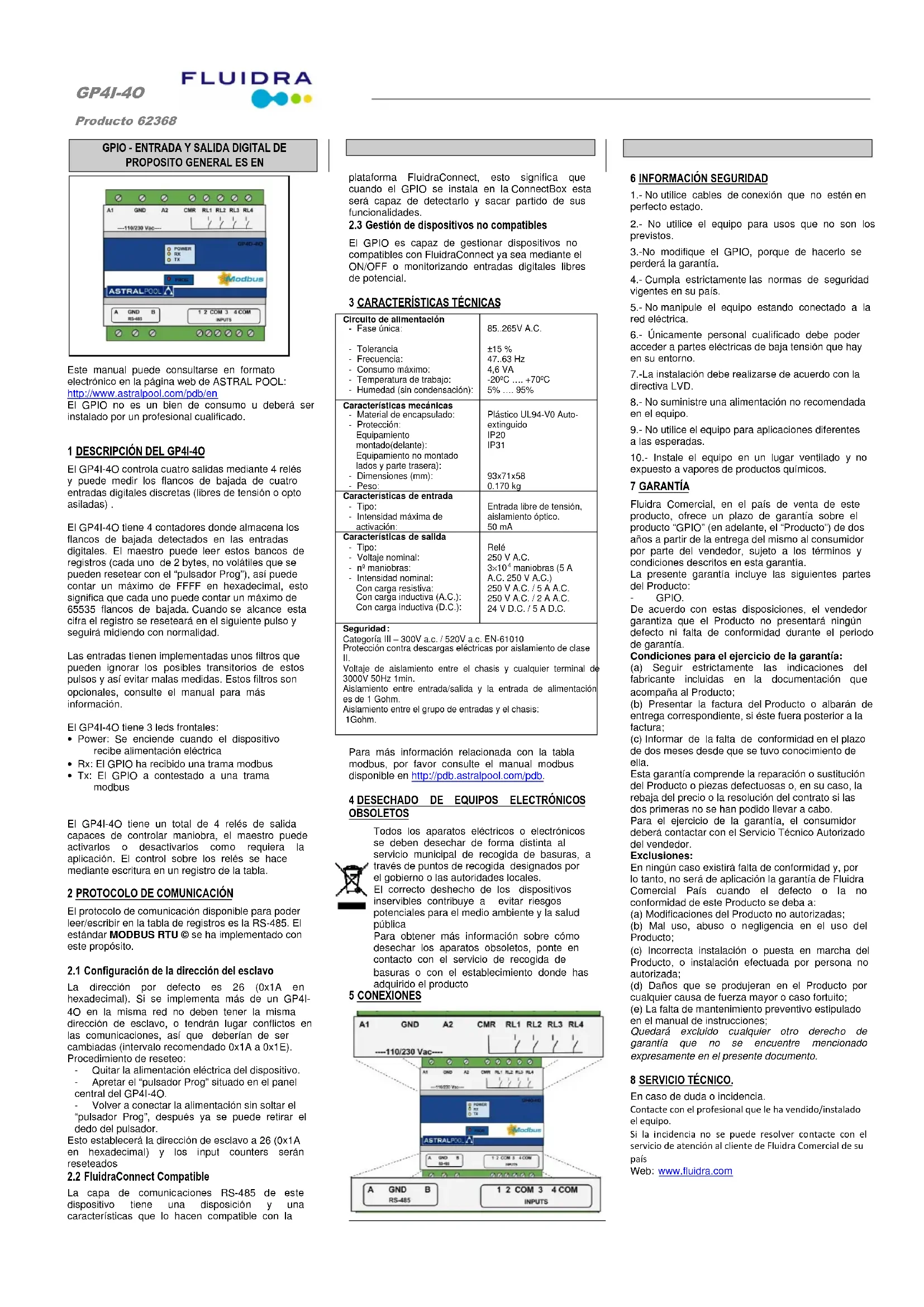 1.- Ne pas utiliser des câbles qui ne sont pas en parfait état. 2.- Ne pas utiliser l'équipement à des fins qui ne sont pas attendus. 3.- Ne pas modifier le ConnectBox, parce que la garantie sera perdue 4.- Respecter les règles de sécurité de conformité du pays. 5.- Ne manipulez pas l'équipement qui est branché sur le secteur. 6.- Seul un professionnel qualifié peut accéder à toutes les pièces électriques entourant l'équipement. 7. L'installation doit-être faite en accord avec la directive LVD. 8.- Ne pas fournir une tension différente de celle recommandée. 9.- Ne pas utiliser l'équipement pour autres applications que celle pr prévue. 10.- Installez l'équipement dans un endroit ventilé et non exposé aux vapeurs et/ou produits chimiques. 7 GARANTÍE Fluidra Comercial situé dans le pays de vente de ce produit offre une période de garantie sur le produit "GPIO" (ci-après le «produit») deux ans après sa livraison au consommateur par le vendeur, sous réserve des modalités et conditions décrites dans la présente garantie. Cette garantie comprend les parties suivantes du produit: - GPIO. Selon ces dispositions, le vendeur garantit que le produit ne doit pas être défaut ou défaut de conformité au cours de la période de garantie. Les conditions d'exercice de la garantie: (A) suivent strictement les instructions du fabricant incluses dans la documentation accompagnant le produit; (B) Pr’esenter la preuve d’achat de type facture ou bon de livraison du produit correspondant, si elle est postérieure à la facture; (C) Rapport du défaut de conformité dans les deux mois à partir de la prise de connaissance de la panne. Cette garantie comprend la réparation ou le remplacement du produit ou des pièces défectueuses ou, si nécessaire, la réduction du prix ou la résiliation du contrat si les deux premiers ont pas été appliquées. Pour exercer la garantie, le consommateur doit communiquer avec le fournisseur de service autorisé. exclusions: Dans tous les cas, il y aura un manque de conformité et, par conséquent, ne sont pas applicables garantie Fluidra Commercial Pays où le défaut ou la non-conformité de ce produit est due à: (A) des modifications non autorisées du produit; (B) une mauvaise utilisation, abus ou négligence d'utilisation du produit; (C) d'installation incorrecte ou mise en service du produit, ou d'une installation faite par une personne non autorisée; (D) Les dommages se produisent dans le produit pour une raison quelconque de force majeure; (E) Le manque d'entretien préventif stipulé dans le manuel d'instruction; Elle est exclue toute autre garantie qui ne sont pas expressément mentionnés ici. 8 SERVICE TECHNIQUE. En cas de doute ou d'incidence. Contactez le professionnel qui a vendu ou installé l'équipement. Si le problème ne peut être résolu, n’hésitez pas à contacter le service client Fluidra Commercial de votre pays. Web: www.fluidra.comGP4I-4O Prodotto 62368