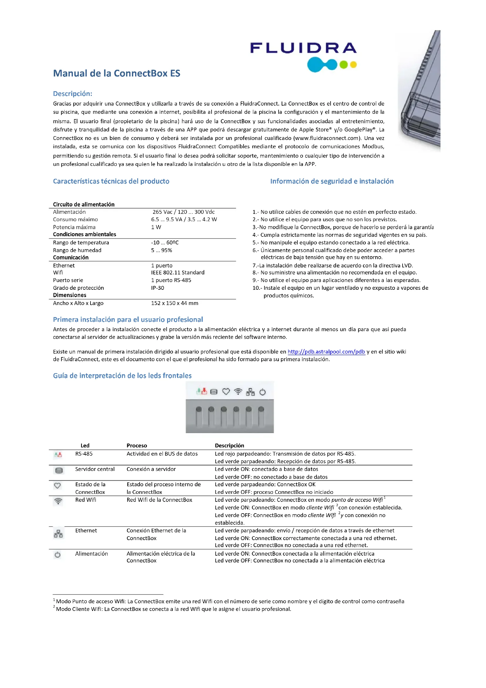 Mise au rebut des appareils électroniques obsolètes 4 Tous les appareils électriques ou électroniques doivent être dirigés vers le service municipal de ramassage des objets, à travers les points de collecte désignés par le gouvernement ou les autorités locales. 5 Une mise au rebut correcte des dispositifs inutilisables, contribue à éviter des risques potentiels pour l'environnement et la santé publique. 6 Pour obtenir plus d'informations sur la manière de se défaire des appareils obsolètes, veuillez contacter le service de ramassage d'objets ou l'établissement dans lequel vous l'avez acquis. Certificat de garantie Fluidra Comercial, dans le pays de vente de cet appareil, propose un délai de garantie sur le produit « ConnectBox » (ci-après désigné l'appareil) de deux ans, à partir de sa livraison au consommateur par le vendeur, dans les termes et les conditions décrits dans cette garantie. La présente garantie couvre les parties de l'appareil suivantes : - ConnectBox - Source d'Alimentation Conformément à ces dispositions, le vendeur garantit que l'appareil ne présentera aucun défaut ni non-conformité pendant la période de garantie. Conditions pour l'exercice de la garantie : (a) Suivre strictement les indications du fabricant comprises dans la documentation jointe à l'appareil ; (b) Présenter la facture de l'appareil, ou le bordereau de livraison correspondant, si celui-ci était ultérieur à la facture ; (c) Informer du manque de conformité dans un délai de deux mois après en avoir eu connaissance. Cette garantie comprend la réparation ou le remplacement de l'appareil ou des pièces défectueuses, ou le cas échéant, une remise sur le prix ou la résiliation du contrat si les deux premiers n'ont pas pu être réalisés. Aux fins de l'exercice de la garantie, le consommateur devra contacter le Service technique agréé du vendeur. Exclusions : En aucun cas, il n'y aura défaut de conformité, et donc la garantie de Fluidra Comercial Pays, ne sera pas applicable, lorsque le défaut ou la non-conformité de cet appareil seront dus à : (a) Modifications sur l'appareil non autorisées ; (b) Mauvaise utilisation, abus ou négligence dans l'utilisation de l'appareil ; (c) Installation ou mise en marche de l'appareil non correcte, ou installation réalisée par une personne non agréée ; (d) Dégâts produits sur l'appareil par une cause de force majeure ou cas fortuit ; (e) Le manque d'entretien préventif indiqué dans le manuel d'instructions ; Sera exclu tout autre droit à la garantie ne se trouvant pas mentionné formellement dans le présent document.Manuale del dispositivo ConnectBox IT Descrizione: Grazie per aver acquistato un dispositivo ConnectBox da utilizzare tramite connessione a FluidraConnect. ConnectBox è una sorta di centralina di controllo che, collegata a Internet, consente al personale tecnico di configurare, mantenere e, in ultima istanza, controllare la vostra piscina. L’utente finale (ovvero, il proprietario della medesima) potrà utilizzare ConnectBox e le rispettive funzioni di intrattenimento, divertimento e relax tramite un’APP scaricabile gratuitamente da Apple Store® e/o GooglePlay®. Non trattandosi di un bene di consumo, è opportuno affidarsi a un professionista qualificato per l’installazione (www.fluidraconnect.com ). Una volta installato, è in grado di comunicare con gli altri dispositivi FluidraConnect Compatibles tramite il protocollo di comunicazione Modbus, consentendone anche la gestione a distanza. Se l’utente finale lo desidera, potrà richiedere assistenza o qualsiasi intervento di manutenzione o di altro tipo a un professionista qualificato, rivolgendosi all’installatore oppure scegliendo un altro nominativo disponibile nell’APP. Specifiche tecniche del prodotto Informazioni circa la sicurezza e l’installazione Prima installazione per l'utente professionale Prima di procedere all’installazione, collegare il dispositivo alla rete elettrica e a Internet per almeno un giorno in modo tale da consentirne il collegamento al server degli aggiornamenti per salvare così la versione più recente del software interno. È disponibile un manuale per utenti professionali contenente le istruzioni da seguire durante la prima installazione. Tale documento, consultabile su http://pdb.astralpool.com/pdb e sul sito wiki di FluidraConnect, è stato utilizzato per la formazione dei professionisti che si accingevano a effettuare la rispettiva prima installazione. Guida di interpretazione dei LED frontali LED Processo Descrizione