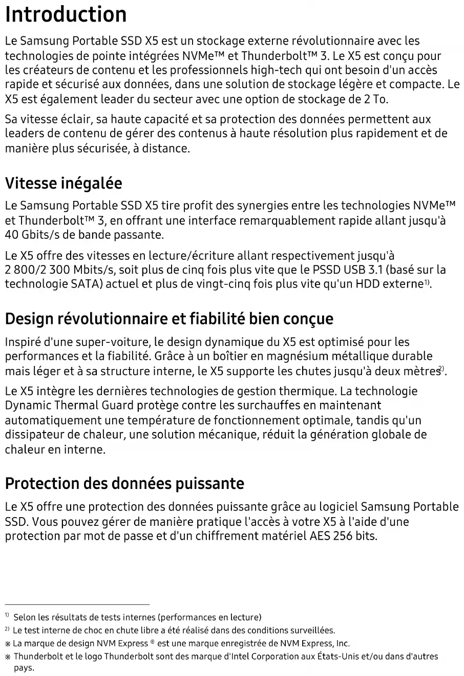 http://opensource.samsung.com/opensource/PortableSSD/seq/016 Avertissements Le non-respect des instructions et des avertissements indiqués dans chacune des sections du présent manuel peut entraîner des blessures, un endommagement du produit ou une perte de données. Lisez-les attentivement avant d'utiliser le produit. Sauvegarde des données importantes Aucun système informatique n'est totalement sécurisé. Samsung n'offre aucune garantie concernant la perte des données stockées sur le X5, quelles que soient les circonstances. Samsung n'est pas tenue responsable des troubles émotifs et/ou physiques et/ou blessures ou préjudices physiques provoqués par une perte ou une restauration des données stockées sur le X5. Assurez-vous de sauvegarder en toutes circonstances les données importantes. Conservation du mot de passe utilisateur Le X5 utilisant des technologies avancées de chiffrement, les données utilisateur ne seront pas accessibles en cas d'oubli ou de perte de votre mot de passe. Inscrivez votre mot de passe sur un papier et conservez-le en lieu sûr. Si le produit est rendu inutilisable en raison de la saisie d'un mot de passe incorrect par l'utilisateur, la seule façon de restaurer le produit consiste à le remettre à sa configuration d'usine via un service en ligne fourni par un centre de service Samsung. Toutefois, cette opération entraîne la perte complète de l'ensemble des données utilisateur. Veillez à sauvegarder régulièrement les données importantes. Connexion aux appareils certifiés ; conformité avec les normes de sécurité Ce produit a été conçu en conformité avec les limites de consommation énergétique définies dans les normes de sécurité. Veillez à utiliser des appareils et des ports d'interface conformes aux normes associées. Chocs et vibrations Veuillez préserver le produit de tout choc violent ou de toute vibration susceptible d'en provoquer le dysfonctionnement ou d'entraîner une perte de données.17 Démontage de l'appareil, endommagement ou retrait de l'étiquette Veillez à ne pas désassembler le produit, ni à endommager ou retirer les autocollants ou avertissements qui y sont apposés. Si le produit a été désassemblé ou endommagé, ou si un autocollant a été retiré par l'utilisateur, toutes les garanties seront considérées comme nulles et non avenues. À des fins de réparations, veuillez contacter uniquement un centre de service Samsung ou les autres fournisseurs de services indiqués par Samsung. Utilisation d'accessoires d'origine Utilisez toujours les pièces et accessoires d'origine fournis ou certifiés par Samsung. Samsung n'est pas responsable de la perte des données utilisateur ou des dommages du produit provoqués par l'utilisation de pièces ou accessoires non d'origine. Utilisation dans des conditions appropriées de température et d'humidité Utilisez le produit dans un environnement approprié : température comprise entre 5 et 35 ℃ et humidité comprise entre 10 et 80 %. Utilisation d'une force excessive pour débrancher le câble Ne tirez pas sur le câble et ne le débranchez pas en utilisant une force excessive. Cela peut rendre instable la connexion ou endommager le connecteur. Analyses antivirus et mises à jour Suivez les consignes de sécurité suivantes afin d'éviter toute intrusion de virus. Installez un logiciel antivirus sur l'ordinateur auquel le X5 est connecté et effectuez régulièrement des analyses antivirus. Équipez-vous des dernières versions de système d'exploitation et de logiciel antivirus en effectuant des mises à jour régulières. Après avoir téléchargé des fichiers sur le X5, exécutez une analyse antivirus avant d'ouvrir tout élément.18 Nettoyage du produit Nous vous recommandons de nettoyer le produit à l'aide d'un chiffon doux. N'utilisez pas d'eau, de substances chimiques ou de détergents. Cela peut entraîner une décoloration ou une corrosion de l'extérieur du produit, mais également provoquer un incendie ou un choc électrique. Éloignement des nourrissons, des enfants et des animaux Les petites pièces présentent un risque potentiel d'étouffement. Veillez donc à éloigner les nourrissons, les enfants, et les animaux pour empêcher qu'ils ne mettent le produit ou des pièces dans leur bouche.19 Spécifications et certifications du produit Caractéristiques du produit Samsung Portable SSD X5 Interface Thunderbolt™ 3 (40 Gbit/s) Compatibilité Matériel) PC Mac et Windows avec ports Thunderbolt 3 (Non rétrocompatible/ne fonctionne pas sur les PC, uniquement par USB) Système d’exploitation) Mac OS Sierra (10.12) ou supérieur/Windows 10 64 bits RS 2 ou supérieur Informations sur le matériel