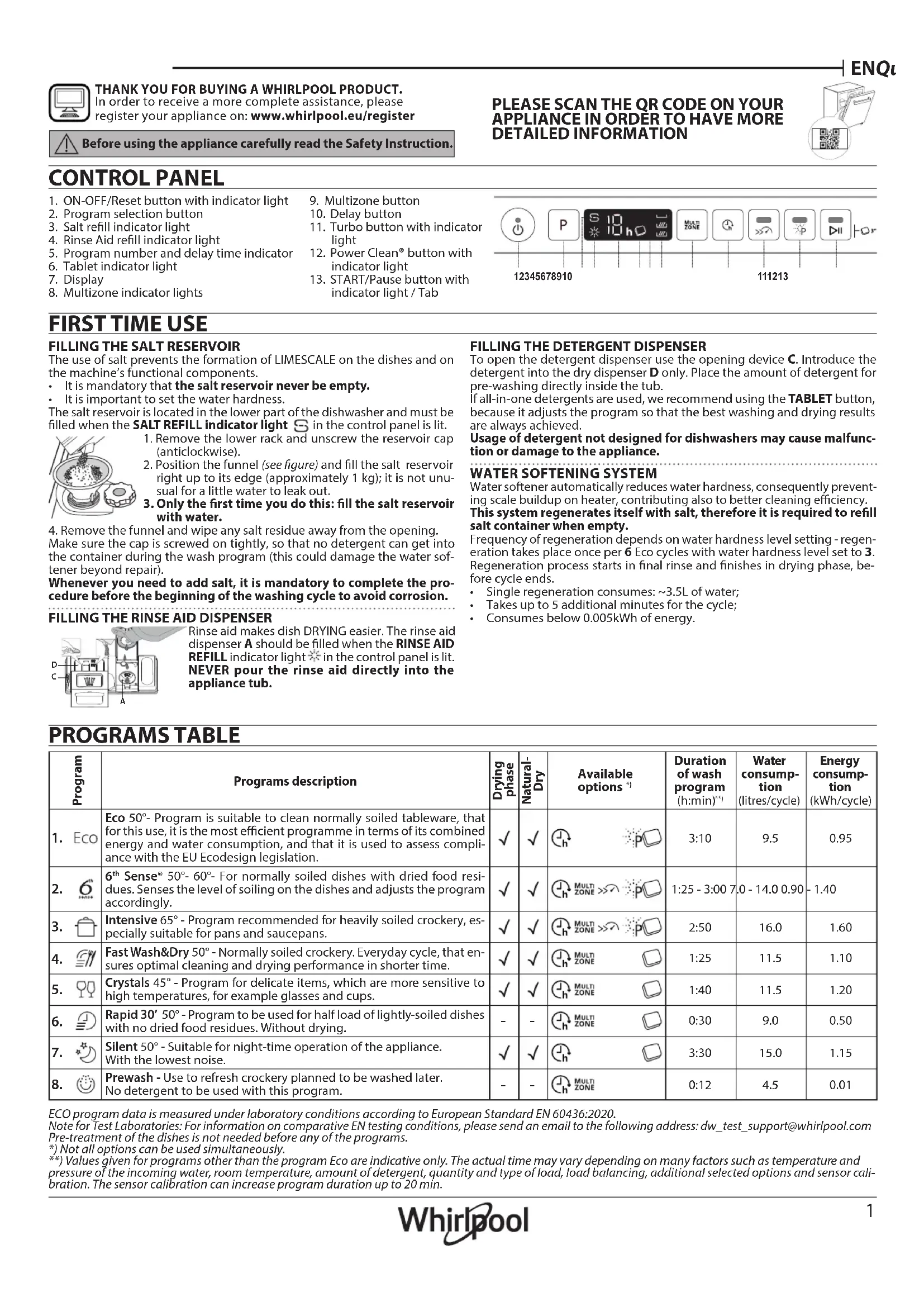 L’eau n’arrive pas au lave-vaisselle. L’acheur indique: H, 6 et le voyant MARCHE/ARRÊT cli- gnote rapidement. L’alimentation d’eau est vide ou le robinet est fermé. Assurez-vous qu’il y a de l’eau dans le circuit d’alimentation ou que le robinet est ouvert. Le tuyau d’arrivée est plié. Assurez-vous que le tuyau d’entrée n’est pas plié (voir INSTALLATION) reprogram- mez le lave-vaisselle et relancez-le. Le tamis dans le tuyau d’arrivée d’eau est obstrué ; il est nécessaire de le nettoyer. Après avoir complété la vérication et le nettoyage, éteignez et rallumez le lave- -vaisselle et redémarrez le programme. Le lave-vaisselle ter- mine le cycle préma- turément L’acheur indique: 15 et le voyant MARCHE/ ARRÊT clignote rapi- dement. Le tuyau de vidange est positionné trop bas ou se vide dans le système d’évacu- ation domestique. Vériez que le tuyau de vidange n’est pas trop engagé dans la canalisation mura- le du réseau d’évacuation des eaux usées (voir INSTALLATION). En cas d’un bran- chement du tuyau de vidange sur le syphon d’un évier de cuisine, il faut installer un dispositif anti retour pour éviter le risque de siphonnage du lave-vaisselle De l’air est présent dans l’alimentation en eau. Vériez si l’alimentation en eau présente des fuites ou d’autres problèmes lais- sant entrer de l’air. Si votre lave-vaisselle ne fonctionne pas correctement, vériez si le problème peut être résolu en suivant la liste ci-après. Pour d’autres erreurs ou problèmes, contactez le Service après-vente agréé dont les coordonnées peuvent être trouvées dans le livret de garantie. Les pièces de rechange seront disponibles pour une période allant jusqu’à 7 ou jusqu’à 10 ans, selon les exigences spéciques du règlement. DÉPANNAGE Merci de scanner le QR code sur votre appareil pour obtenir des informations plus détaillées.10 Guida RapidaIT GRAZIE PER AVER ACQUISTATO UN PRODOTTO WHIRLPOOL. Per ricevere assistenza in modo più completo, registrare il pro- prio apparecchio sul sito: www.whirlpool.eu/register