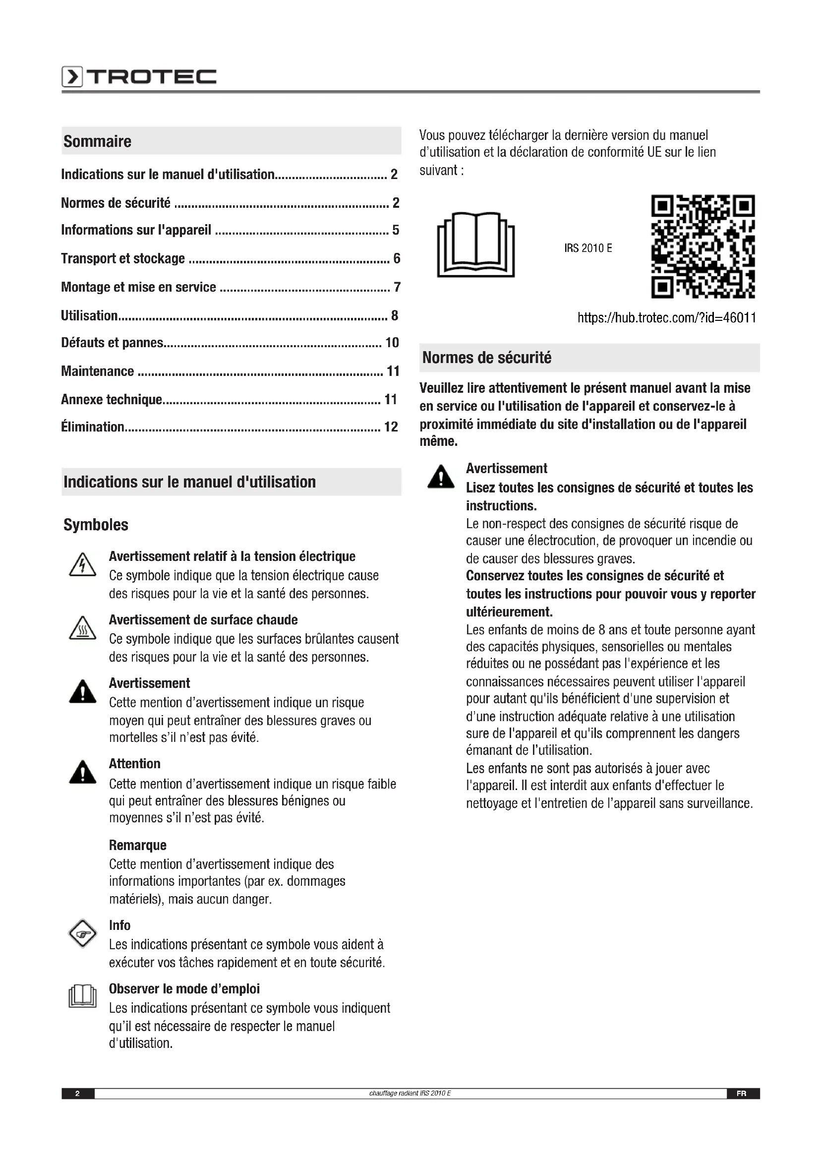 - Élimination Indications sur le manuel d'utilisation Symboles Avertissement relatif à la tension électrique Ce symbole indique que la tension électrique cause des risques pour la vie et la santé des personnes. Avertissement de surface chaude Ce symbole indique que les surfaces brûlantes causent des risques pour la vie et la santé des personnes. Avertissement Cette mention d’avertissement indique un risque moyen qui peut entraîner des blessures graves ou mortelles s’il n’est pas évité. Attention Cette mention d’avertissement indique un risque faible qui peut entraîner des blessures bénignes ou moyennes s’il n’est pas évité. Remarque Cette mention d’avertissement indique des informations importantes (par ex. dommages matériels), mais aucun danger. Info Les indications présentant ce symbole vous aident à exécuter vos tâches rapidement et en toute sécurité. Observer le mode d’emploi Les indications présentant ce symbole vous indiquent qu’il est nécessaire de respecter le manuel d'utilisation. Vous pouvez télécharger la dernière version du manuel d’utilisation et la déclaration de conformité UE sur le lien suivant: IRS 2010 E https://hub.trotec.com/?id=46011 Normes de sécurité Veuillez lire attentivement le présent manuel avant la mise en service ou l'utilisation de l'appareil et conservez-le à proximité immédiate du site d'installation ou de l'appareil même. Avertissement Lisez toutes les consignes de sécurité et toutes les instructions. Le non-respect des consignes de sécurité risque de causer une électrocution, de provoquer un incendie ou de causer des blessures graves. Conservez toutes les consignes de sécurité et toutes les instructions pour pouvoir vous y reporter ultérieurement. Les enfants de moins de 8 ans et toute personne ayant des capacités physiques, sensorielles ou mentales réduites ou ne possédant pas l'expérience et les connaissances nécessaires peuvent utiliser l'appareil pour autant qu'ils bénéficient d'une supervision et d’une instruction adéquate relative à une utilisation sure de l'appareil et qu'ils comprennent les dangers émanant de l’utilisation. Les enfants ne sont pas autorisés à jouer avec l'appareil. Il est interdit aux enfants d'effectuer le nettoyage et l'entretien de l’appareil sans surveillance.FR 3 chauffage radiant IRS 2010 E Avertissement Les enfants de moins de 3ans doivent être tenus à l'écart de l'appareil, sauf s’ils sont l’objet d’une surveillance constante. Les enfants âgés de 3 à 8ans n’ont le droit d’allumer et d’éteindre l’appareil que s’ils font l’objet d’une surveillance ou s’ils ont reçu une instruction adéquate relative à une utilisation sure de l'appareil et qu'ils ont compris les dangers liés à cette utilisation, à condition que l’appareil soit placé ou installé dans sa position normale d’utilisation. Les enfants âgés de 3 à 8ans n’ont pas le droit de brancher la fiche secteur dans la prise, de réguler l’appareil, de le nettoyer ni d’effectuer l’entretien utilisateur. Avertissement N’utilisez pas l’appareil dans des pièces de taille réduite s’il s’y trouve des personnes incapables de quitter la pièce de manière autonome et qu’elles ne sont pas sous surveillance permanente. p. 12