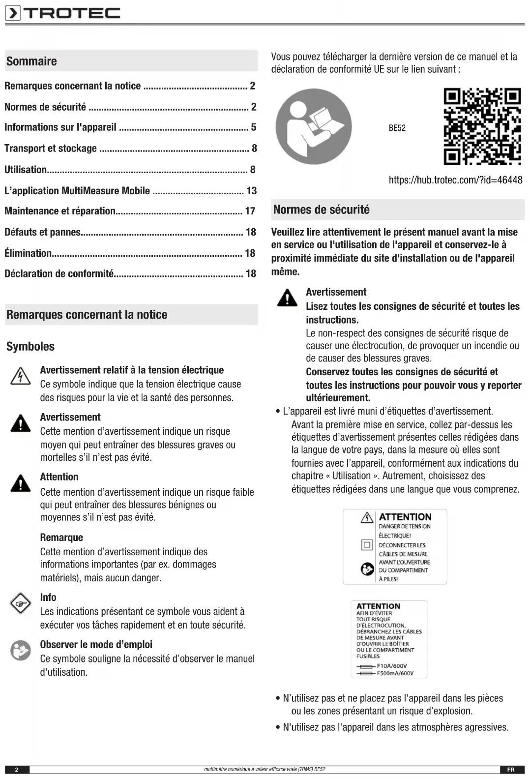 - (TRMS)2 FR multimètre numérique à valeur efficace vraie (TRMS) BE52 Sommaire Remarques concernant la notice p. 2