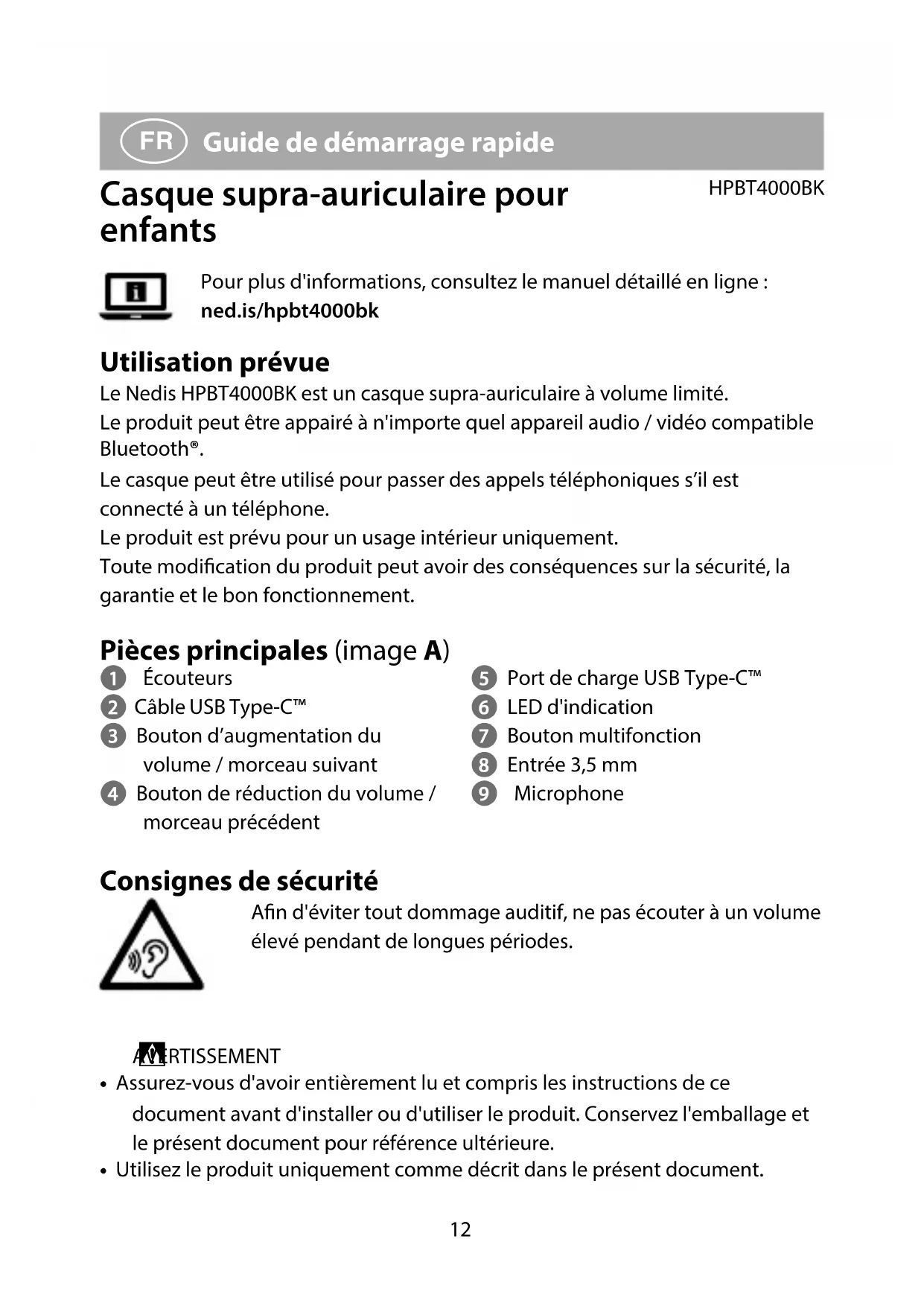 Guide de démarrage rapide Casque supra-auriculaire pour enfants HPBT4000BKPour plus d'informations, consultez le manuel détaillé en ligne : ned.is/hpbt4000bk Utilisation prévue Le Nedis HPBT4000BK est un casque supra-auriculaire à volume limité.Le produit peut être appairé à n'importe quel appareil audio / vidéo compatible Bluetooth®.Le casque peut être utilisé pour passer des appels téléphoniques s’il est connecté à un téléphone.Le produit est prévu pour un usage intérieur uniquement.Toute modication du produit peut avoir des conséquences sur la sécurité, la garantie et le bon fonctionnement. Pièces principales (image A) 1 Écouteurs 2 Câble USB Type-C™ 3 Bouton d’augmentation du volume / morceau suivant 4 Bouton de réduction du volume / morceau précédent 5 Port de charge USB Type-C™ 6 LED d'indication 7 Bouton multifonction 8 Entrée 3,5 mm 9 Microphone Consignes de sécurité An d'éviter tout dommage auditif, ne pas écouter à un volume élevé pendant de longues périodes. AVERTISSEMENT• Assurez-vous d'avoir entièrement lu et compris les instructions de ce document avant d'installer ou d'utiliser le produit. Conservez l'emballage et le présent document pour référence ultérieure.• Utilisez le produit uniquement comme décrit dans le présent document.13