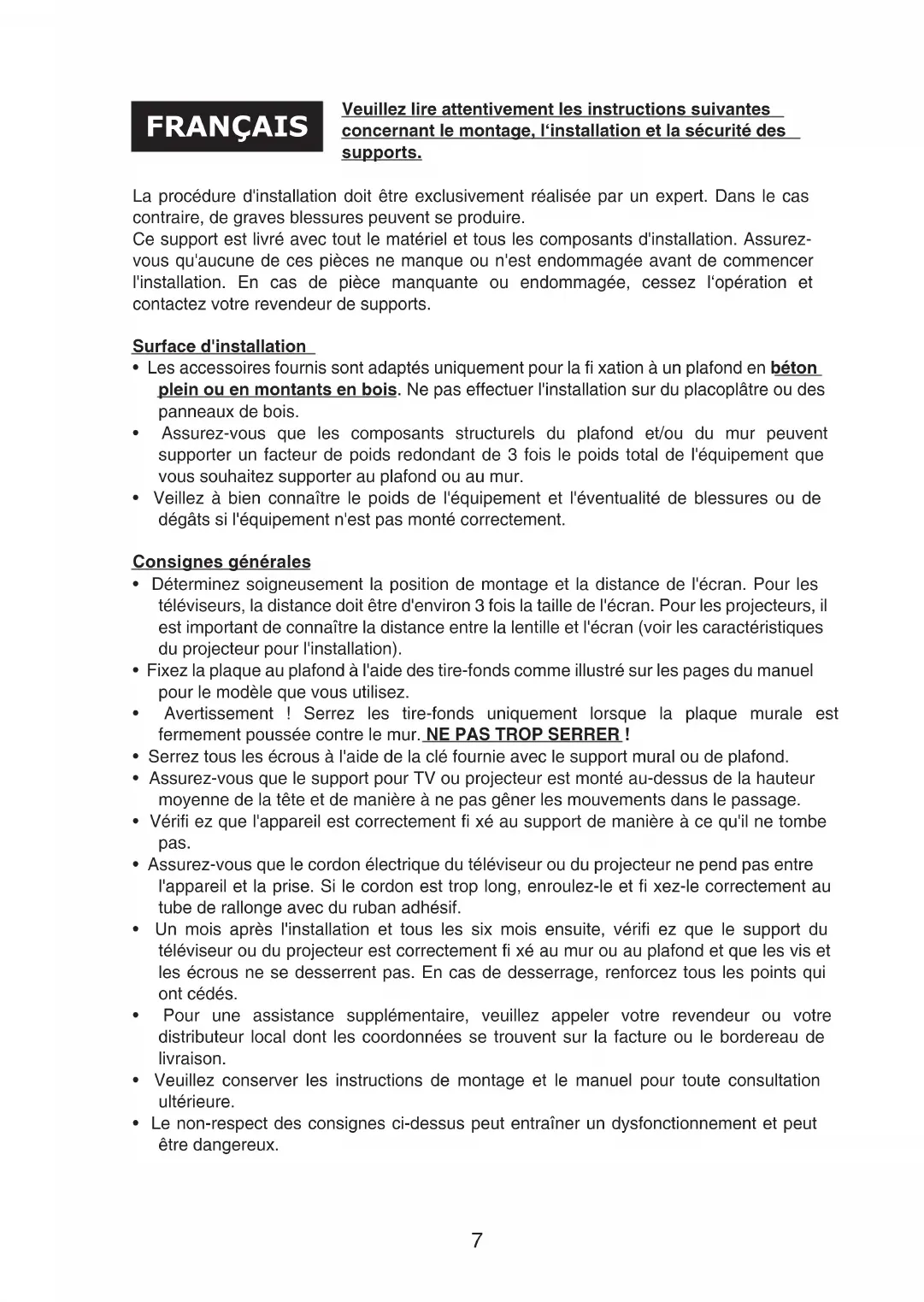 - Un mois après l'installation et tous les six mois ensuite, vérifi ez que le support du téléviseur ou du projecteur est correctement fi xé au mur ou au plafond et que les vis et les écrous ne se desserrent pas. En cas de desserrage, renforcez tous les points qui ont cédés.