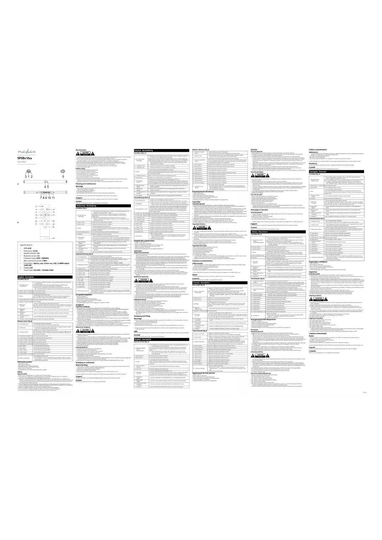 - Nettoyez l'appareil avec un chion doux et humide. Séchez soigneusement l'appareil avec un chion propre et sec. Support Si vous avez des commentaires, des suggestions ou besoin d'aide, veuillez visiter www.nedis.com/support Contact NEDIS B.V., De Tweeling 28, 5215 MC ‘s-Hertogenbosch, Pays-Bas Italiano - Descrizione Soundbar (g. A)