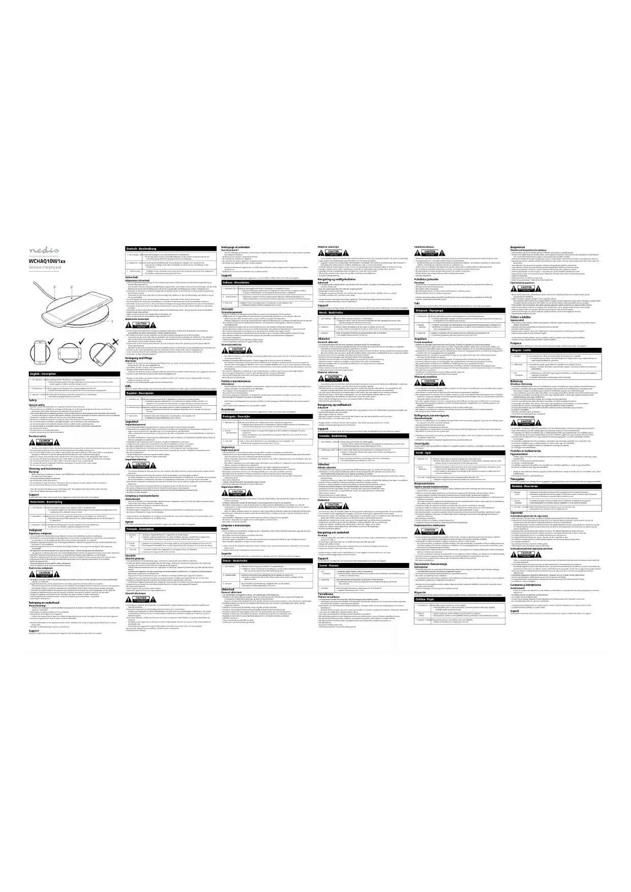 - Nettoyez l'extérieur de l'appareil avec un chion doux et humide. Séchez soigneusement l'appareil avec un chion propre et sec.• Nettoyez les ouvertures de ventilation avec une brosse douce. Support Si vous avez des commentaires, des suggestions ou besoin d'aide, veuillez visiter www.nedis.com/support. Italiano - Descrizione 1. Indicatore LED • L’indicatore lampeggia lentamente: Il dispositivo è in modalità di ricarica.• L’indicatore lampeggia rapidamente: Sul dispositivo è stato rilevato un oggetto metallico estraneo o l’alimentatore non è in grado di fornire corrente a sucienza.