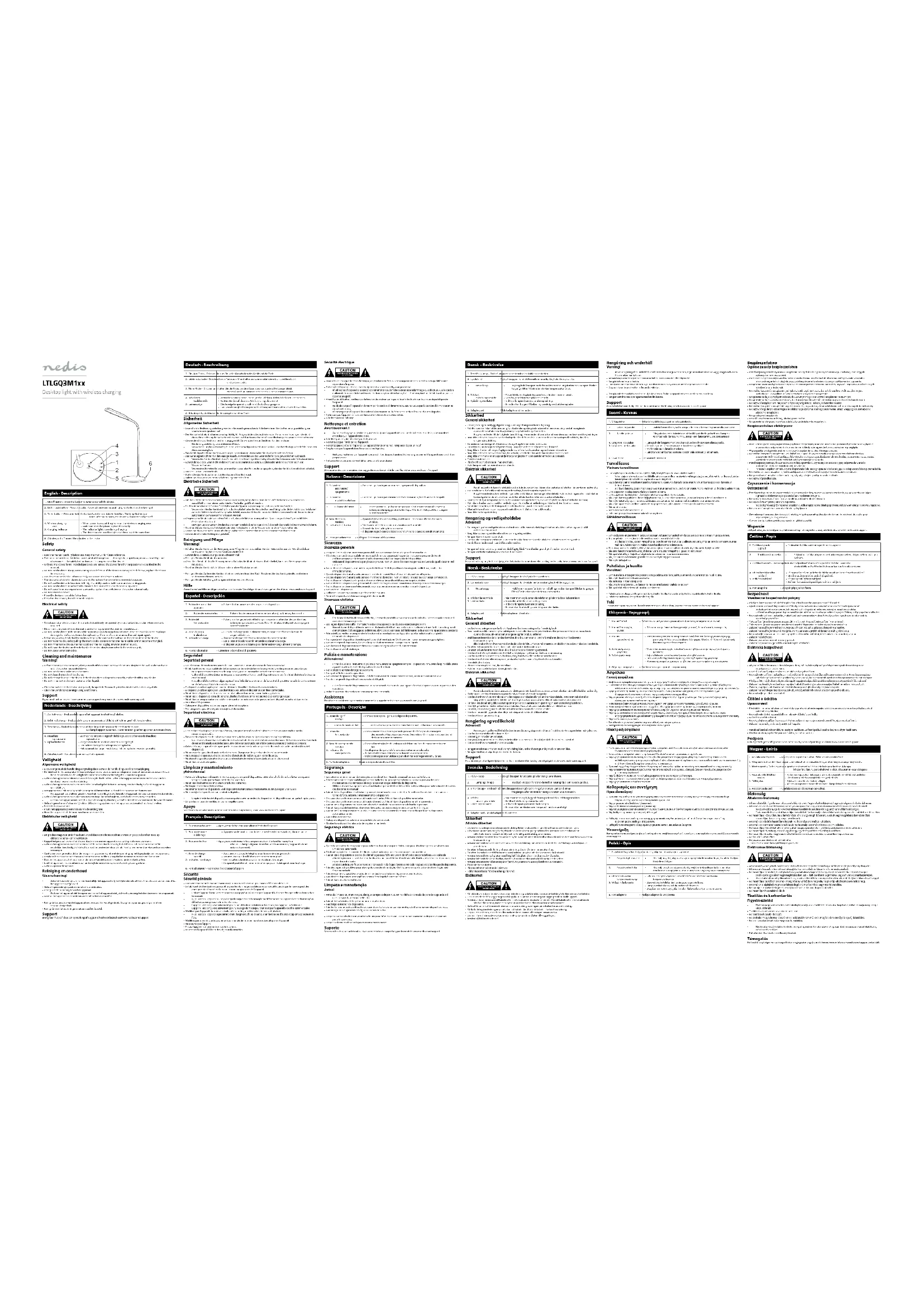 - Limpie las ranuras de ventilación con un cepillo suave. Apoyo Si necesita ayuda adicional o si tiene comentarios o sugerencias, visite www.nedis.com/support Français - Description 1. Bouton marche/arrêt • Appuyez sur le bouton pour allumer/éteindre l'appareil.2. Bouton de mode d'éclairage• Appuyez sur le bouton pour faire alterner les éclairages naturel, blanc et jaune.3. Bouton minuteur • Appuyez et maintenez le bouton pour accéder à la fonction compte à rebours. La lampe clignote deux fois. Après 40 minutes, l'appareil s'éteint automatiquement.4. Zone de charge sans l5. Indicateur de charge• Sous tension, placez le téléphone sur la zone de charge sans l.• Assurez-vous que le téléphone est correctement placé.• Les indicateurs lumineux sont allumés durant la charge.• L'appareil peut être utilisé en même temps pour l'éclairage et pour la charge.6. Port adaptateur • Connectez l'adaptateur à l'appareil. Sécurité Sécurité générale
