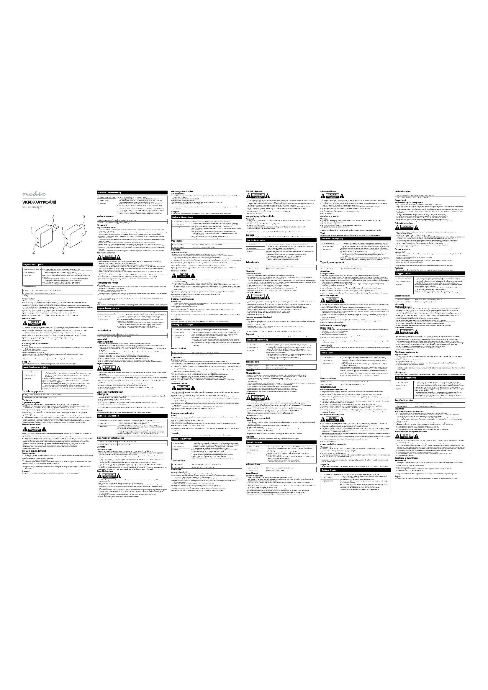 - Antes de la limpieza o el mantenimiento, apague siempre el dispositivo, retire el enchufe de red de la toma de pared y espere hasta que se haya enfriado el dispositivo.• No utilice disolventes de limpieza ni productos abrasivos.• No limpie el interior del dispositivo.• No intente reparar el dispositivo. Si el dispositivo no funciona correctamente, sustitúyalo por uno nuevo.• No sumerja el dispositivo en agua ni otros líquidos.• Limpie el exterior del dispositivo con un paño suave humedecido. Seque bien el dispositivo con un paño limpio y seco. Apoyo Si necesita ayuda adicional o si tiene comentarios o sugerencias, visite www.nedis.com/support Français - Description 1. Port USB (USB C) • Vériez la tension d'entrée de votre appareil USB et celle du chargeur USB pour vous assurer qu'elles correspondent. Assurez-vous que le courant total ne dépasse pas le courant de sortie nominal du chargeur USB.• Connectez un câble de charge adapté à votre appareil USB et au port USB.Remarque: Pour assurer la sécurité et des performances optimales, utilisez le câble de charge d'origine de votre appareil USB.• Insérez la che secteur dans la prise murale. Le chargeur USB détecte le meilleur mode de charge et démarre automatiquement la charge de votre appareil USB.Remarque: Votre appareil USB devrait indiquer qu'il est en mode charge.• Déconnectez le chargeur USB de la prise murale s'il n'est pas en usage.2. Port USB (USB A)3. Fiche secteur Caractéristiques techniques 1. Port USB (USB C) 30W / 5V-3A, 9V-3A, 12V-2.5A, 15V-2A, 20V-1.5A2. Port USB (USB A) 18W / 3,6-6V-3A, 6-9V-2A, 9-12V-1,5A Sécurité Sécurité générale
