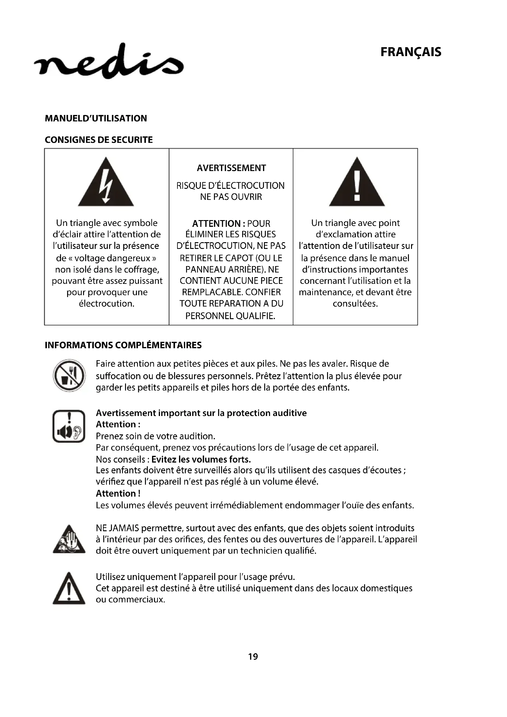 Précautions de sécurité: Pour réduire le risque de choc électrique, ce produit ne doit être ouvert que par un technicien qualié si une réparation s’impose. Débranchez l’appareil et les autres équipements du secteur s’il y a un problème. Ne pas exposer l’appareil à l’eau ni à l’humidité. Entretien: Ne nettoyez l’appareil qu’avec un chion sec. N’utilisez pas de solvants ni des produits abrasifs. Garantie: Aucune garantie ou responsabilité ne sera acceptée en cas de modication et/ou de transformation de l’appareil ou en cas de dommages provoqués par une utilisation incorrecte de l’appareil. Generale: Le design et les caractéristiques techniques sont sujets à modication sans notication préalable. Tous les logos de marques et noms de produits sont des marques déposées ou immatriculées dont leurs détenteurs sont les propriétaires et sont donc reconnues comme telles dans ce document. Conservez ce manuel et l’emballage pour toute référence ultérieure. Attention: Ce symbole gure sur l’appareil. Il signie que les produits électriques et électroniques ne doivent pas être jetés avec les déchets domestiques. Le système de collecte est diérent pour ces produits. Ce produit est fabriqué et délivré en conformité avec toutes les directives et règlements applicables et en vigueur dans tous les états membre de l’Union Européenne. Il est également conforme aux spécications et à la réglementation en vigueur dans le pays de vente. La documentation ocielle est disponible sur demande. Cela inclut mais ne se limite pas à: La déclaration de conformité (et à l’identication du produit), la che technique concernant la sécurité des matériaux, les rapports de test du produit. Veuillez contacter notre centre de service à la clientèle pour plus d’assistance: via le site Web: http://www.nedis.fr/fr-fr/contact/formulaire-de-contact.htm via courriel: service@nedis.com via téléphone: +31 (0)73-5993965 (aux heures de bureau) NEDIS B.V., De Tweeling 28, 5215 MC ’s-Hertogenbosch, PAYS-BAS28 NEDERLANDS GEBRUIKSAANWIJZING VEILIGHEIDSAANWIJZINGEN WAARSCHUWING KANS op ELECTRISCHE SCHOK NIET OPENEN Een driehoek met een bliksemschicht wil de aandacht van de gebruiker vestigen op “gevaarlijke voltage”, zonder isolatie, binnenin het apparaat die hoog genoeg kan zijn om een elektrische schok te veroorzaken. VOORZICHTIG: VERWIJDER