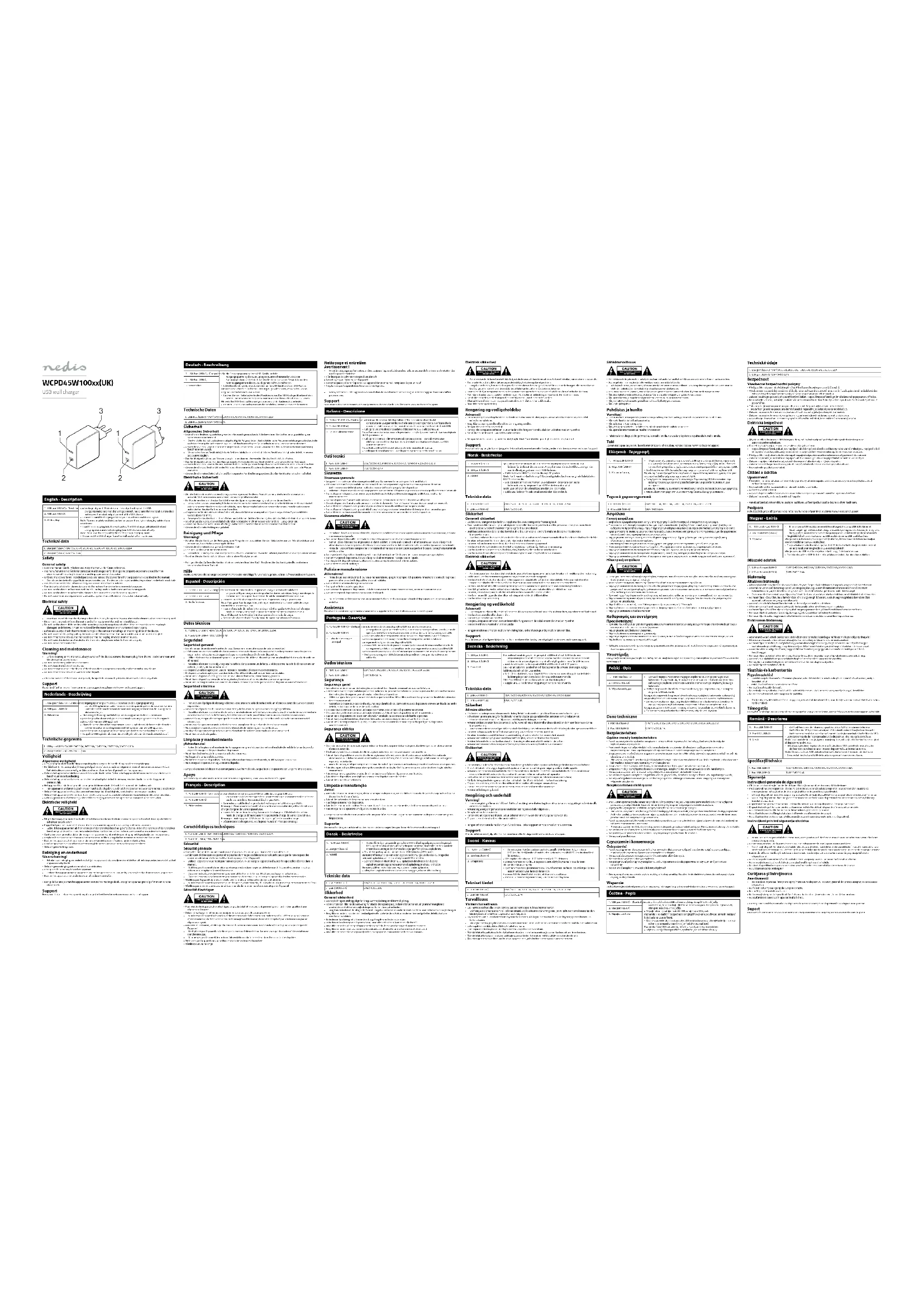 - Antes de la limpieza o el mantenimiento, apague siempre el dispositivo, retire el enchufe de red de la toma de pared y espere hasta que se haya enfriado el dispositivo.• No utilice disolventes de limpieza ni productos abrasivos.• No limpie el interior del dispositivo.• No intente reparar el dispositivo. Si el dispositivo no funciona correctamente, sustitúyalo por uno nuevo.• No sumerja el dispositivo en agua ni otros líquidos.• Limpie el exterior del dispositivo con un paño suave humedecido. Seque bien el dispositivo con un paño limpio y seco. Apoyo Si necesita ayuda adicional o si tiene comentarios o sugerencias, visite www.nedis.com/support Français - Description 1. Port USB (USB C) • Vériez la tension d'entrée de votre appareil USB et celle du chargeur USB pour vous assurer qu'elles correspondent. Assurez-vous que le courant total ne dépasse pas le courant de sortie nominal du chargeur USB.• Connectez un câble de charge adapté à votre appareil USB et au port USB.Remarque: Pour assurer la sécurité et des performances optimales, utilisez le câble de charge d'origine de votre appareil USB.• Insérez la che secteur dans la prise murale. Le chargeur USB détecte le meilleur mode de charge et démarre automatiquement la charge de votre appareil USB.Remarque: Votre appareil USB devrait indiquer qu'il est en mode charge.• Déconnectez le chargeur USB de la prise murale s'il n'est pas en usage.2. Port USB (USB A)3. Fiche secteur Caractéristiques techniques