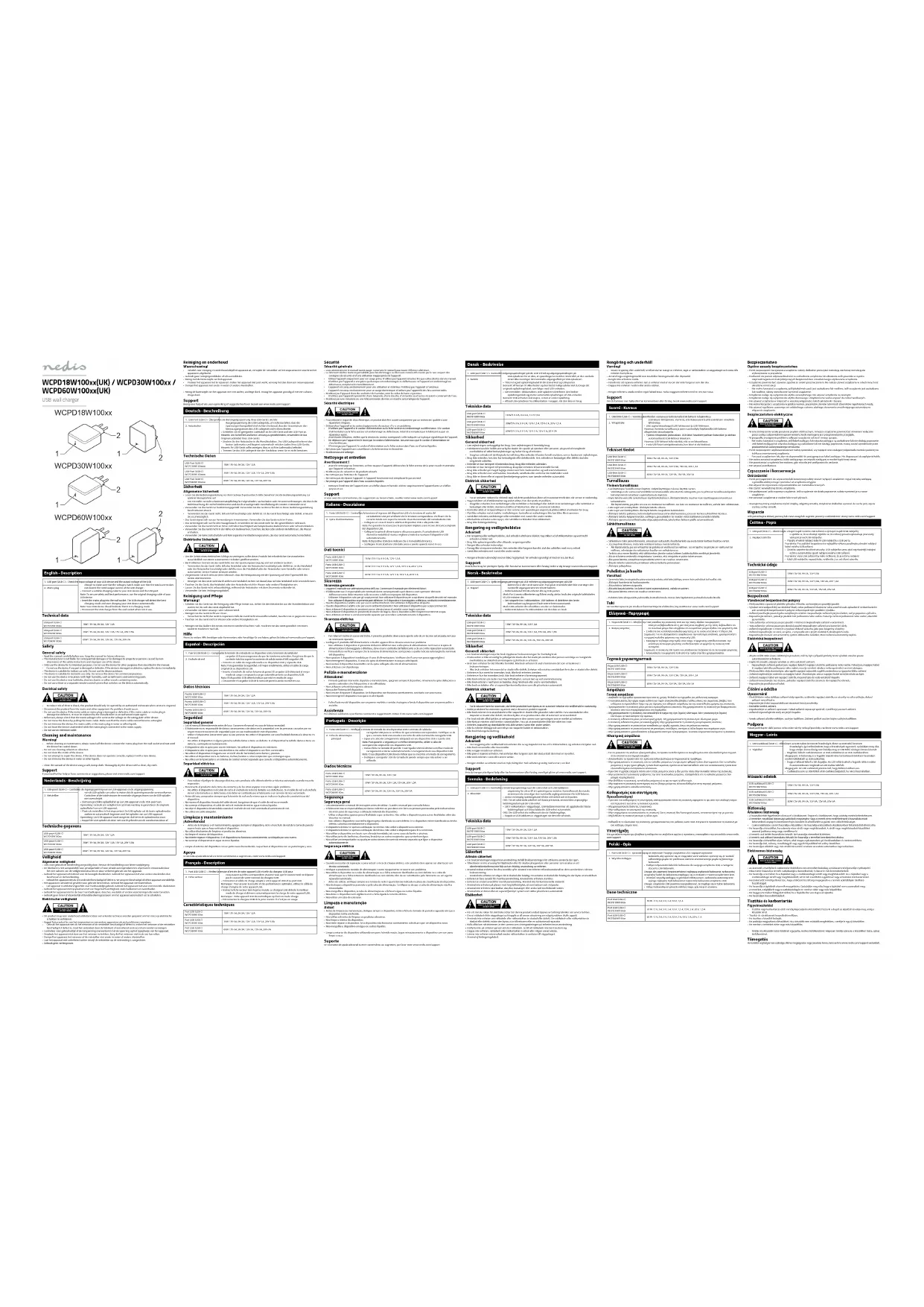 - Antes de la limpieza o el mantenimiento, apague siempre el dispositivo, retire el enchufe de red de la toma de pared y espere hasta que se haya enfriado el dispositivo.• No utilice disolventes de limpieza ni productos abrasivos.• No limpie el interior del dispositivo.• No intente reparar el dispositivo. Si el dispositivo no funciona correctamente, sustitúyalo por uno nuevo.• No sumerja el dispositivo en agua ni otros líquidos.• Limpie el exterior del dispositivo con un paño suave humedecido. Seque bien el dispositivo con un paño limpio y seco. Apoyo Si necesita ayuda adicional o si tiene comentarios o sugerencias, visite www.nedis.com/support Français - Description 1. Port USB (USB C) • Vériez la tension d'entrée de votre appareil USB et celle du chargeur USB pour vous assurer qu'elles correspondent. Assurez-vous que le courant total ne dépasse pas le courant de sortie nominal du chargeur USB.• Connectez un câble de charge adapté à votre appareil USB et au port USB.Remarque: Pour assurer la sécurité et des performances optimales, utilisez le câble de charge d'origine de votre appareil USB.• Insérez la che secteur dans la prise murale. Le chargeur USB détecte le meilleur mode de charge et démarre automatiquement la charge de votre appareil USB.Remarque: Votre appareil USB devrait indiquer qu'il est en mode charge.• Déconnectez le chargeur USB de la prise murale s'il n'est pas en usage.2. Fiche secteur Caractéristiques techniques Port USB (USB C)WCPD18W100xx18W / 5V-3A, 9V-2A, 12V-1,5APort USB (USB C)WCPD30W100xx30W / 5V-3A, 9V-2A, 12V-1,5A, 15V-2A, 20V-1,5APort USB (USB C)WCPD60W100xx60W / 5V-3A, 9V-3A, 12V-3A, 15V-3A, 20V-3A Sécurité Sécurité générale