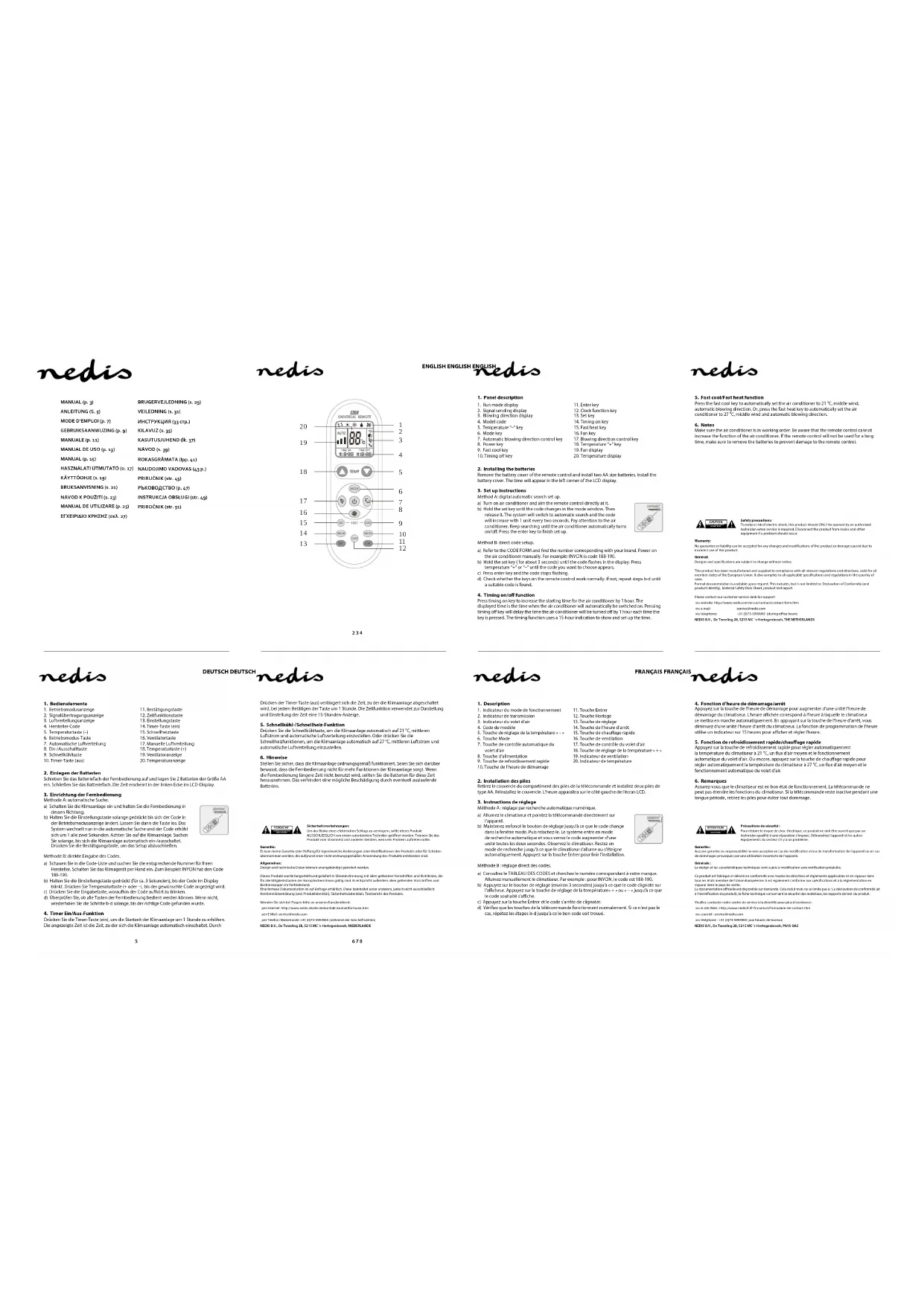 Assurez-vous que le climatiseur est en bon état de fonctionnement. La télécommande ne peut pas étendre les fonctions du climatiseur. Si la télécommande reste inactive pendant une longue période, retirez les piles pour éviter tout dommage. ATTENTIONRISQUE DE CHOC ELECTRIQUENE PAS OUVRIRPrécautions de sécurité:Pour réduire le risque de choc électrique, ce produit ne doit être ouvert que par un technicien qualié si une réparation s’impose. Débranchez l'appareil et les autres équipements du secteur s'il y a un problème. Garantie: Aucune garantie ou responsabilité ne sera acceptée en cas de modication et/ou de transformation de l'appareil ou en cas de dommages provoqués par une utilisation incorrecte de l'appareil.Générale:Le design et les caractéristiques techniques sont sujets à modication sans notication préalable. Ce produit est fabriqué et délivré en conformité avec toutes les directives et règlements applicables et en vigueur dans tous les états membre de l'Union Européenne. Il est également conforme aux spécications et à la réglementation en vigueur dans le pays de vente. La documentation ocielle est disponible sur demande. Cela inclut mais ne se limite pas à: La déclaration de conformité (et à l'identication du produit), la che technique concernant la sécurité des matériaux, les rapports de test du produit. Veuillez contacter notre centre de service à la clientèle pour plus d'assistance:via le site Web: http://www.nedis.fr/fr-fr/contact/formulaire-de-contact.htmvia courriel: service@nedis.comvia téléphone: +31 (0)73-5993965 (aux heures de bureau)NEDIS B.V., De Tweeling 28, 5215 MC ’s-Hertogenbosch, PAYS-BASCAUTIONRISK OF ELECTRIC SHOCKDO NOT OPENSafety precautions:To reduce risk of electric shock, this product should ONLY be opened by an authorized technician when service is required. Disconnect the product from mains and other equipment if a problem should occur. Warranty:No guarantee or liability can be accepted for any changes and modications of the product or damage caused due to incorrect use of this product.General:Designs and specications are subject to change without notice. This product has been manufactured and supplied in compliance with all relevant regulations and directives, valid for all member states of the European Union. It also complies to all applicable specications and regulations in the country of sales.Formal documentation is available upon request. This includes, but is not limited to: Declaration of Conformity (and product identity), Material Safety Data Sheet, product test report.Please contact our customer service desk for support:via website: http://www.nedis.com/en-us/contact/contact-form.htmvia e-mail: service@nedis.comvia telephone: +31 (0)73-5993965 (during oce hours)NEDIS B.V., De Tweeling 28, 5215 MC ’s-Hertogenbosch, THE NETHERLANDS10 11 12