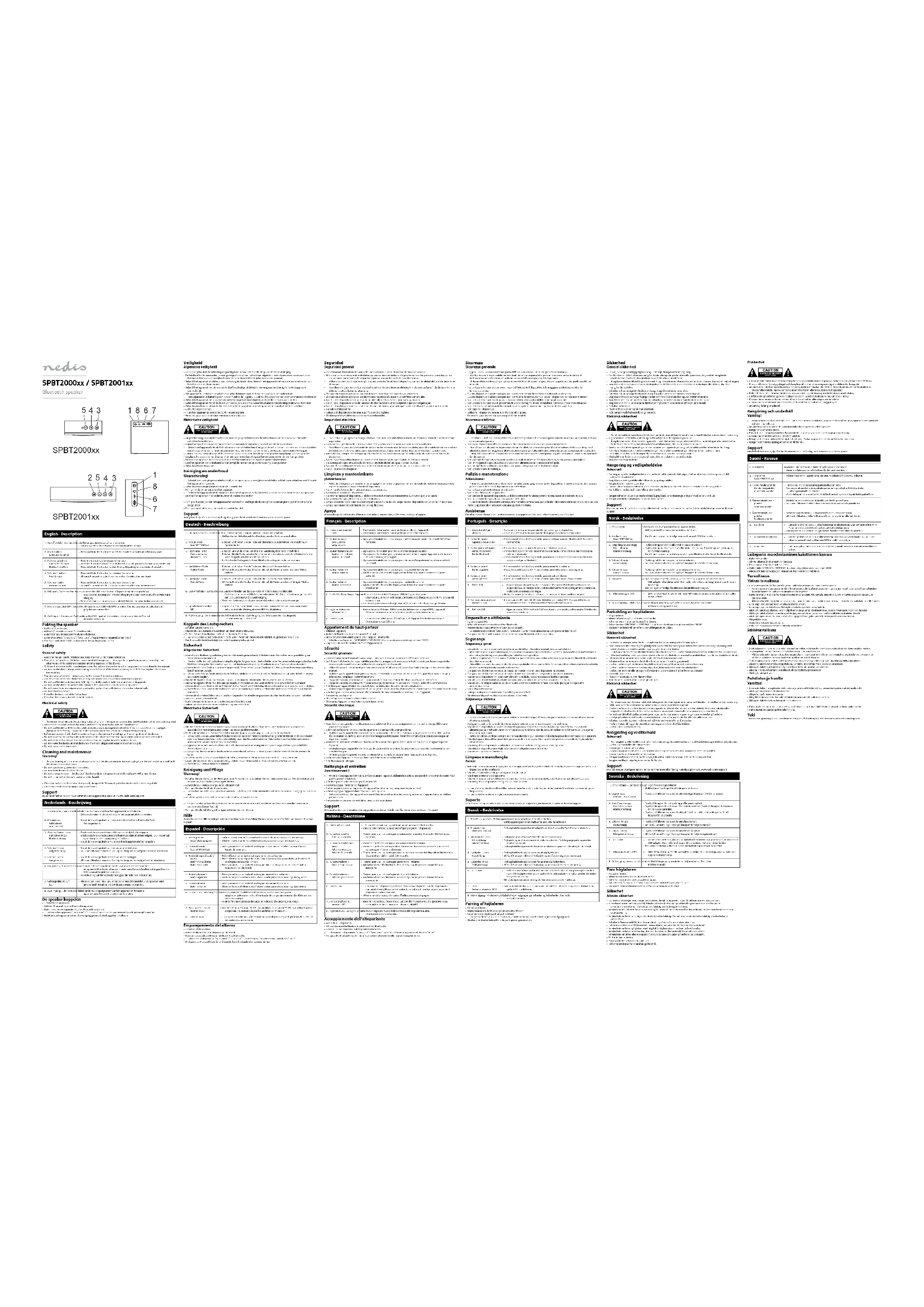 - Antes de la limpieza o el mantenimiento, apague siempre el dispositivo, retire el enchufe de red de la toma de pared y espere hasta que se haya enfriado el dispositivo.• No utilice disolventes de limpieza ni productos abrasivos.• No limpie el interior del dispositivo.• No intente reparar el dispositivo. Si el dispositivo no funciona correctamente, sustitúyalo por uno nuevo.• No sumerja el dispositivo en agua ni otros líquidos.• Limpie el exterior del dispositivo con un paño suave humedecido. Seque bien el dispositivo con un paño limpio y seco.• Limpie las ranuras de ventilación con un cepillo suave. Apoyo Si necesita ayuda adicional o si tiene comentarios o sugerencias, visite www.nedis.com/support Français - Description 1. Interrupteur marche/arrêt• Positionnez l'interrupteur sur marche pour allumer l'appareil.• Positionnez l'interrupteur sur marche pour éteindre l'appareil.2. Bouton de mode (SPBT2001xx uniquement)• Appuyez et maintenez le bouton pour sélectionner le mode : Bluetooth/AUX/Carte mémoire.3. Bouton lecture/pause Bouton mains libres Bouton Bluetooth• Appuyez sur le bouton pour lire ou mettre en pause la piste.• Appuyez sur le bouton pour prendre ou mettre n à l'appel. Appuyez sur le bouton deux fois pour rejeter l'appel.• Appuyez et maintenez le bouton pour démarrer l'appariement ou déconnecter le Bluetooth.4. Bouton volume + Bouton suivant• Appuyez et maintenez le bouton pour augmenter le volume.• Mode carte SD / Bluetooth : Appuyez sur le bouton pour sélectionner la piste suivante.5. Bouton volume - Bouton précédent• Appuyez et maintenez le bouton pour réduire le volume.• Mode carte SD / Bluetooth : Appuyez sur le bouton pour sélectionner la piste précédente.6. Port USB • Pour charger l'appareil, connectez le câble USB au port USB de l'appareil et à un adaptateur USB ou un ordinateur. L'indicateur de charge rouge s'allume. L'appareil est en charge.• Une fois le processus de charge terminé, l'indicateur de charge rouge s'éteint.7. Logement de carte mémoire (SD)• Insérez la carte SD (maxi. 32Go) avec des chiers de musique MP3. L'appareil démarre automatiquement la lecture des chiers de musique MP3.