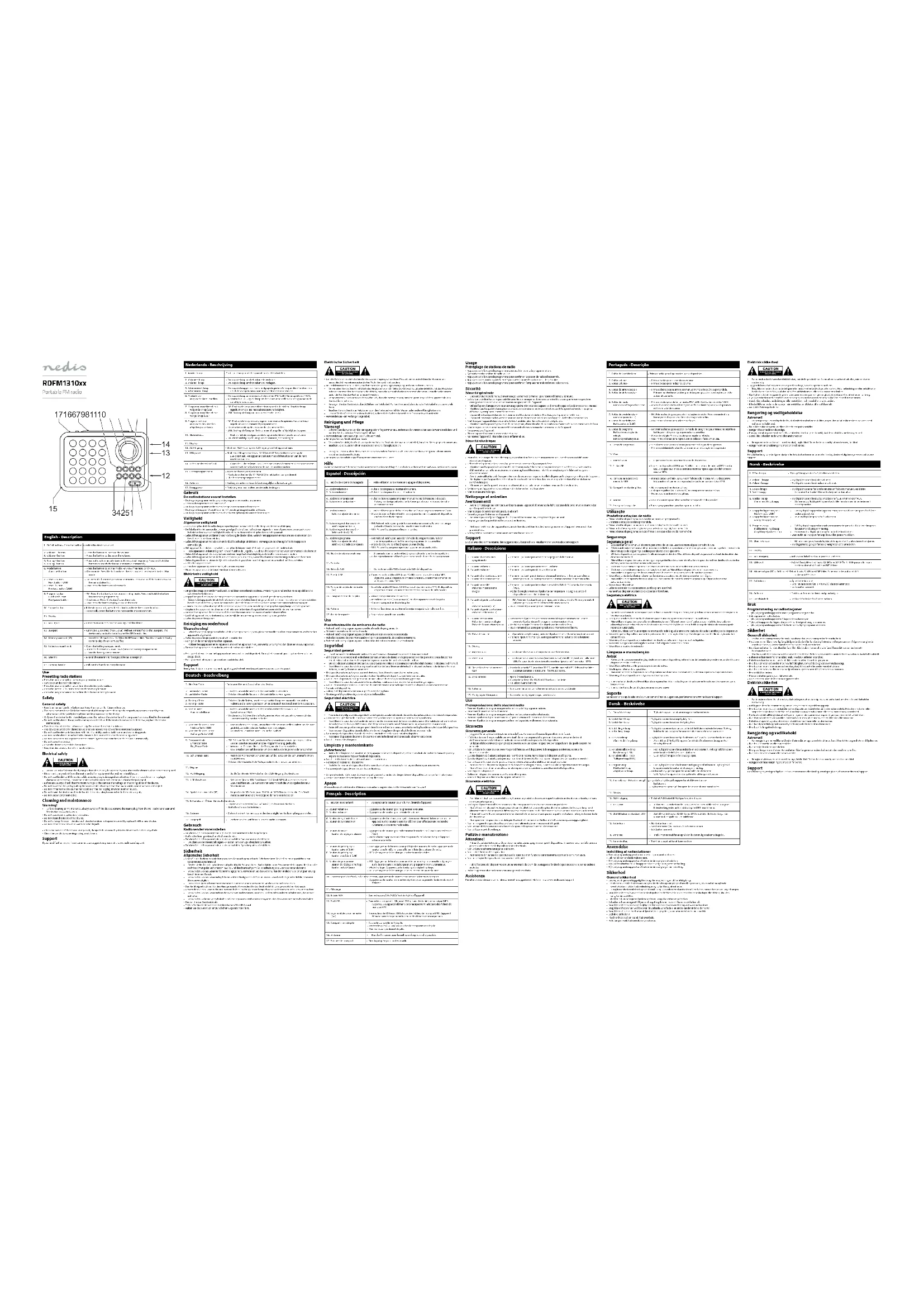 - Nettoyez l'extérieur de l'appareil avec un chion doux et humide. Séchez soigneusement l'appareil avec un chion propre et sec.• Nettoyez les ouvertures de ventilation avec une brosse douce. Support Si vous avez des commentaires, des suggestions ou besoin d'aide, veuillez visiter www.nedis.com/support Italiano - Descrizione 1. Pulsante di accensione/spegnimento• Premere il pulsante per accendere o spegnere il dispositivo.2. Pulsante volume +3. Pulsante volume -• Premere il pulsante per aumentare il volume.• Premere il pulsante per diminuire il volume.4. Pulsante di sintonizzazione +5. Pulsante di sintonizzazione -• Premere i pulsanti per sintonizzarsi manualmente sulla frequenza richiesta. Tenere premuti i pulsanti per cercare automaticamente le stazioni radio. 6. Pulsante modalità Pulsante impostazione sveglia• Premere il pulsante per impostare la modalità: FM / USB / scheda di memoria / AUX.• Modalità sveglia: Premere il pulsante per impostare la sveglia quando il dispositivo è in modalità stand-by.7. Pulsante di preimpostazione Pulsante Avanti (USB)8. Pulsante di preimpostazione - Pulsante Indietro (USB)