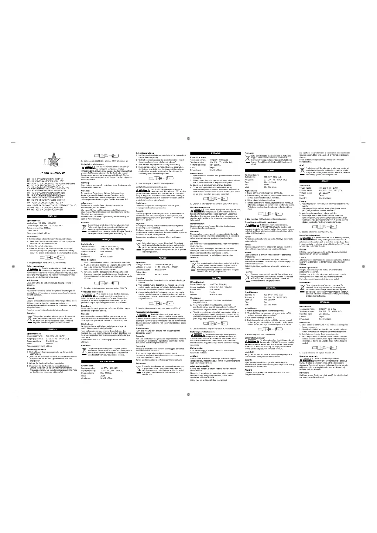 Consignes de sécurité : Pour réduire le risque de choc électrique, ce produit ne doit être ouvert que par un technicien qualié si une réparation s’impose. Débranchez l’appareil et les autres équipements du secteur s’il y a un problème. Ne pas exposer l’appareil à l’eau ni à l’humidité. Entretien : Ne nettoyez l’appareil qu’avec un chiffon sec. N’utilisez pas de solvants ou de produits abrasifs. Garantie : Aucune garantie ou responsabilité ne sera acceptée en cas de modication et/ou de transformation du produit ou en cas de dommages provoqués par une utilisation incorrecte de l’appareil. Généralités : Le design et les caractéristiques techniques sont sujets à modication sans notication préalable. Tous les logos de marques et noms de produits sont des marques déposées ou immatriculées dont leurs détenteurs sont les propriétaires et sont donc reconnues comme telles dans ce documents. Conservez ce manuel et l’emballage pour toute référence ultérieure. Attention : Ce symbole gure sur l’appareil. Il signie que les produits électriques et électroniques ne doivent pas être jetés avec les déchets domestiques. Le système de collecte est différent pour ce genre de produits. NEDERLANDS Specicaties: Ingangsspanning: 100-230V~ 50Hz (AC) Uitgangsspanning: 3 / 4,5 / 6 / 7,5 / 9 / 12V (DC) Uitgangsstroom: Max. 2250mA Kleur: Zwart Afmetingen: 96 x 50 x 30mm Gebruiksaanwijzing: