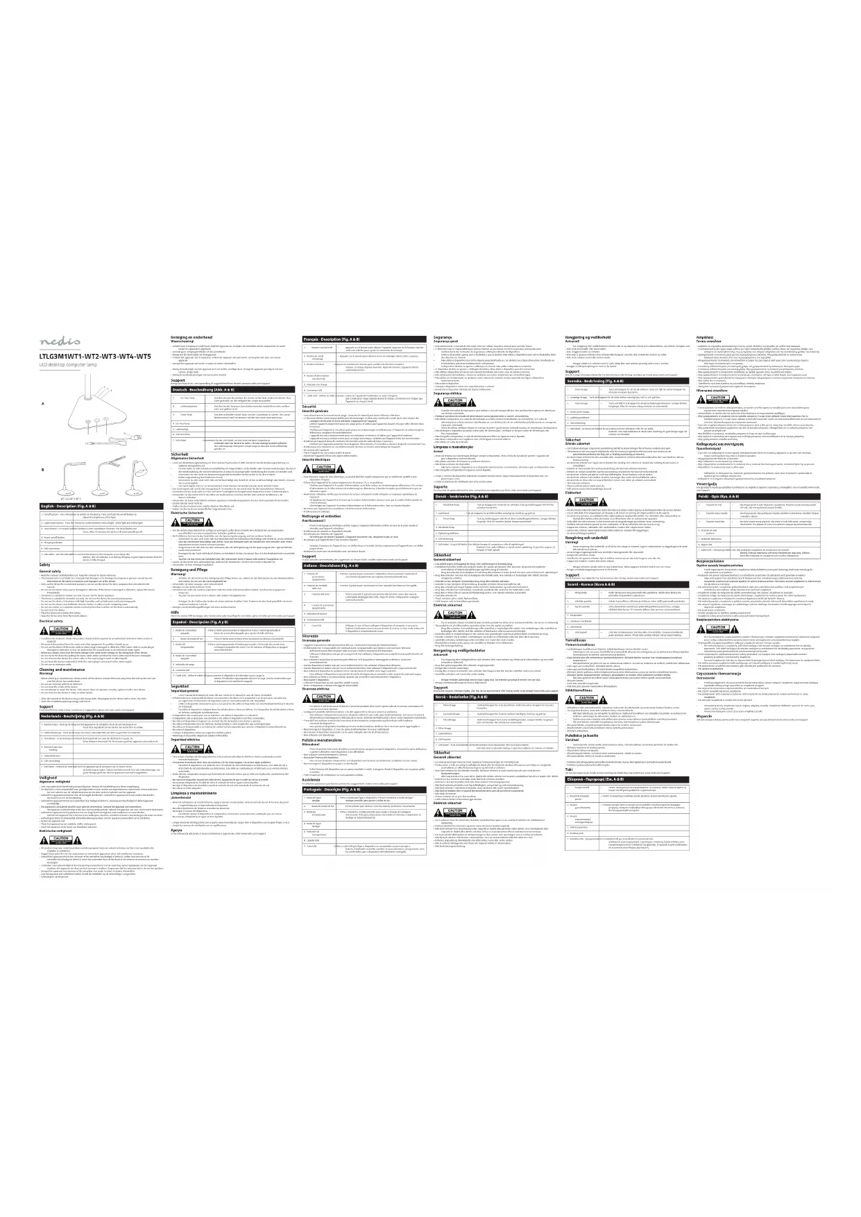- Nettoyez l'extérieur de l'appareil avec un chion doux et humide. Séchez soigneusement l'appareil avec un chion propre et sec.• Nettoyez les ouvertures de ventilation avec une brosse douce. Support Si vous avez des commentaires, des suggestions ou besoin d'aide, veuillez visiter www.nedis.com/support Italiano - Descrizione (Fig. A e B) 1. Pulsante di accensione/spegnimento• Premere il pulsante per accendere il dispositivo. Tenere premuto il pulsante di accensione/spegnimento per regolare la luminosità della luce.2. Pulsante di modalità della luce• Premere il pulsante per commutare tra luce naturale, luce bianca e luce gialla.