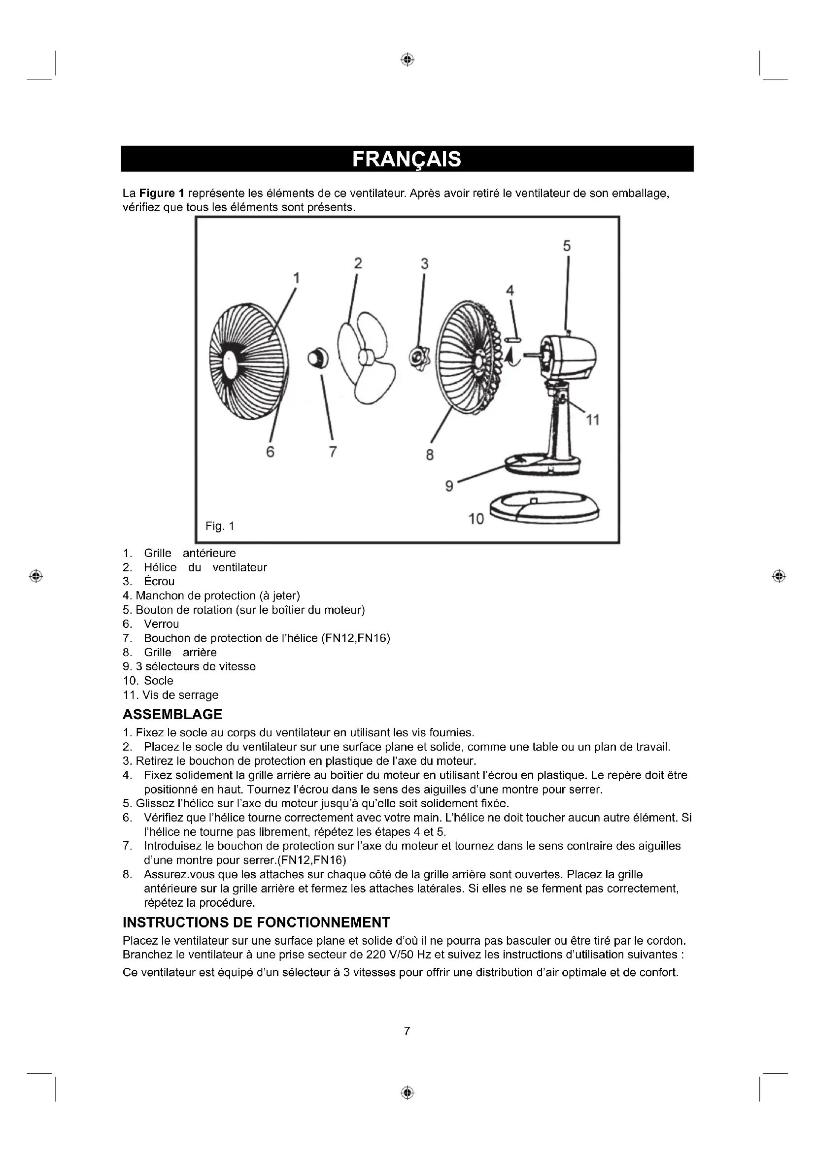 Placez le ventilateur sur une surface plane et solide d’où il ne pourra pas basculer ou être tiré par le cordon. Branchez le ventilateur à une prise secteur de 220 V/50 Hz et suivez les instructions d’utilisation suivantes : Ce ventilateur est équipé d’un sélecteur à 3 vitesses pour offrir une distribution d’air optimale et de confort. Fig. 18