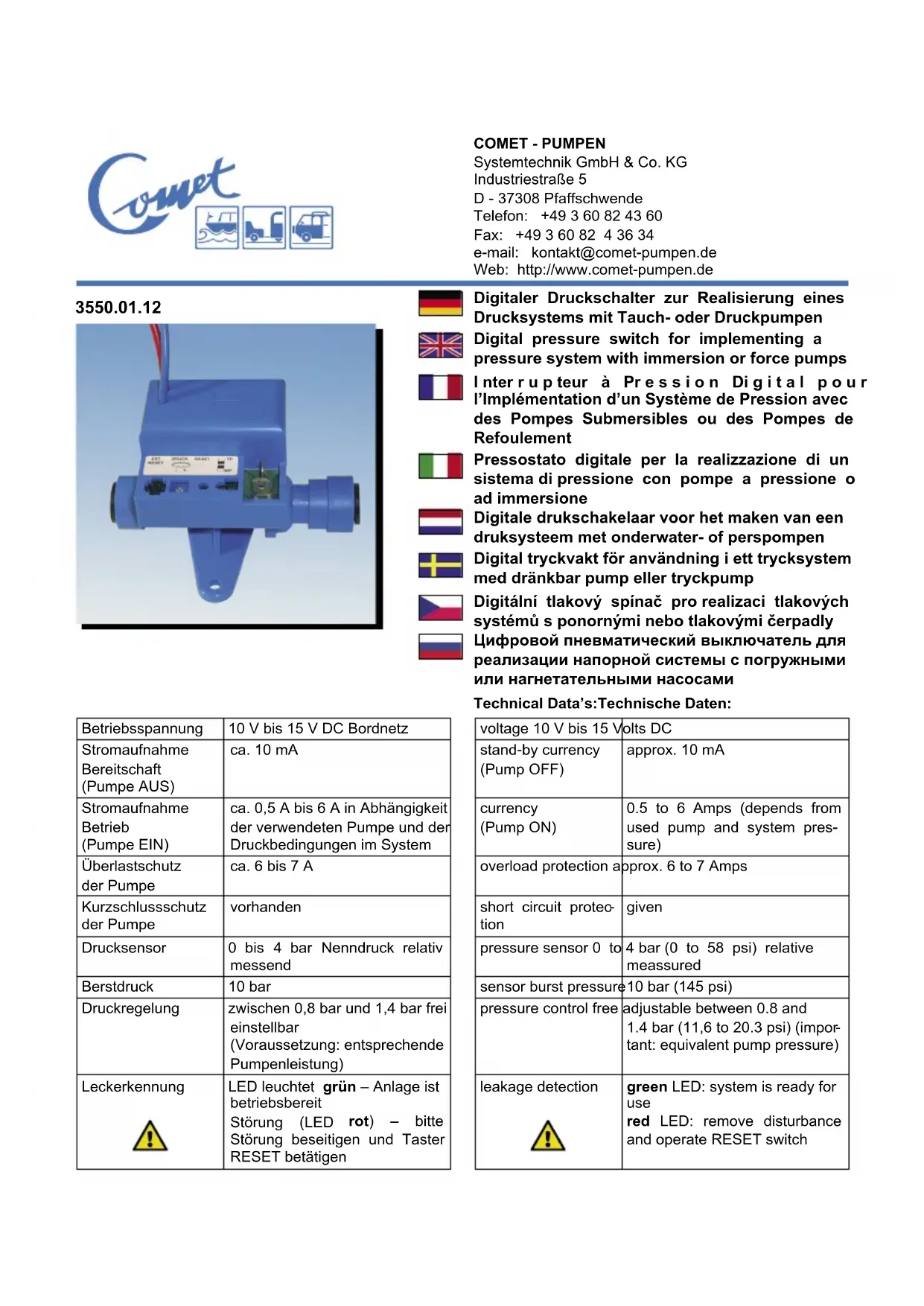 ations de pression changes dans le système sont transférés, à des fins d’évaluation, comme des signaux électriques d’un contrôleur de micropro- cesseur. Ainsi, on détecte des baisses de pression exceptionnelles dans le système (une valve per- méable, des fuites dans le système et positions des tuyaux) et on débranche la pompe. Ainsi, on peut prévenir les dégâts causés aux véhicules de camping causés par les eaux! 1 Connecteurs à 4 pins, pour désignation externe de panne par voie de LED et reset externe 2 Potentiomètre servant au calibrage de la pression finale 3 Bouton-poussoir de Reset, servant à un accusé de réception de l’occurrence d‘une panne 4 LED à deux couleurs, servant à indiquer une panne 5 Commutateur DIP pour sélectionner le type de pompe 6 Câble de raccordement pour 12 V DC (+ sur rouge) 7 Alvéoles de raccordement 6,3 x 0,8 pour la connexion des pompes 8 Borne à fiche pour tuyau PE Ø 12 mm (v. fig.) Borne à fiche pourtuyau de Ø 10 mm de diamètre intérieur (o. fig.) Eléments de service: Interrupteur à Pression Digital pour l’Implémentation d’un Système de Pression avec des Pompes Submersibles ou des Pompes de Refoulement 3550.01.12 Connexion John Guest Système de fiches Ø 12 mm 3550.01.20 Connexion X-Fix 3550.01.21 Connexion Tülle Des détails concernant la protection de l’environnement: Selon l’étiquette, les matériaux sont réutilisables. A travers la réutilisation, le recyclage de matériaux ou d’autres modes de recyclage d’électroménagers usagés, vous faites une importante contribution dans le but de protéger l’environnement. Veuillez bien consulter votre administration communale sur le lieu convenable pour l’élimination de déchets. A la fin de sa vie utile, ce produit ne peut être éliminé comme des déchets ménagers ; il devra plutôt être remis chez un point de ramassage pour le recyclage de dispositifs électriques et électroniques. Le sym