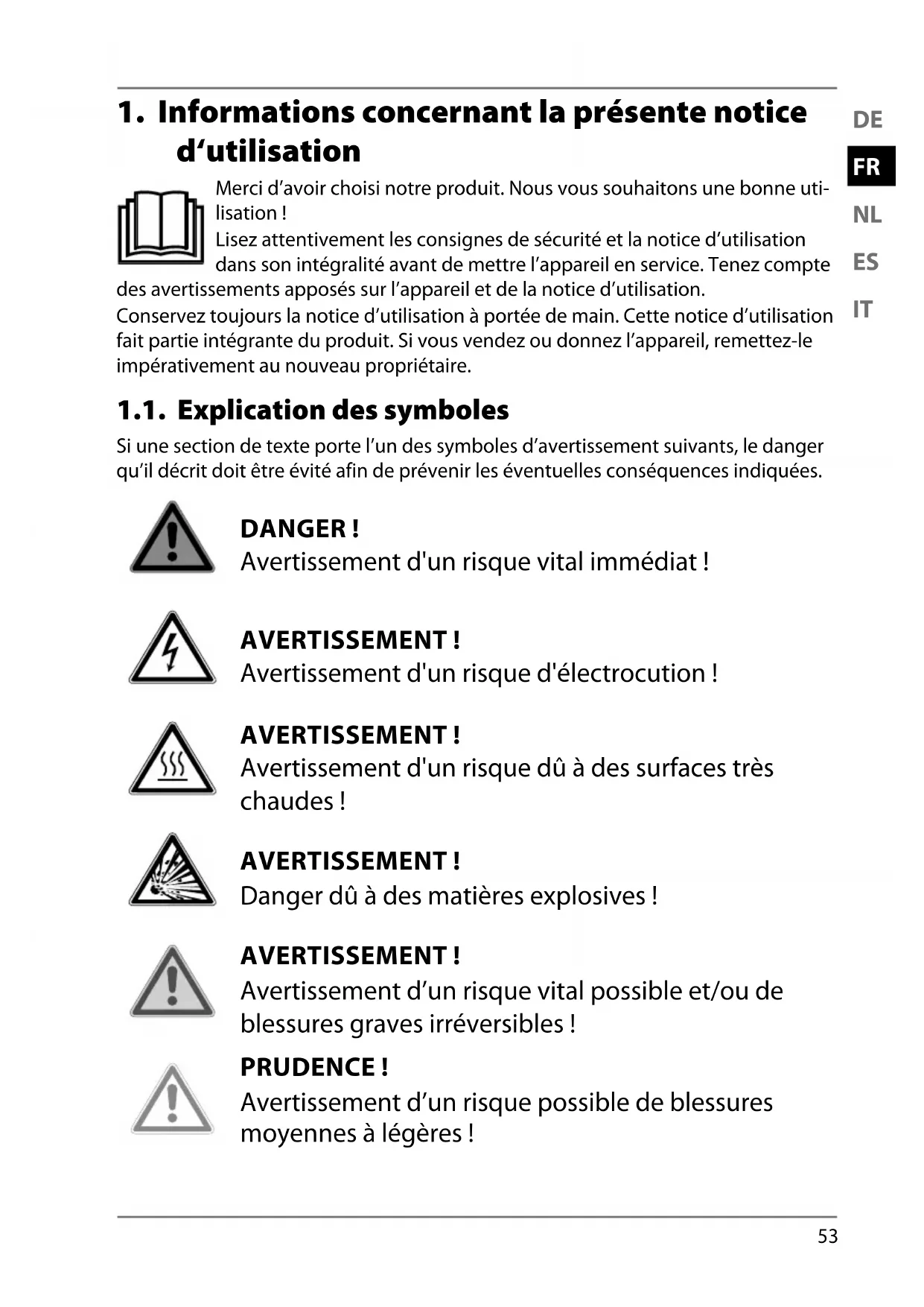 d‘utilisation Merci d’avoir choisi notre produit. Nous vous souhaitons une bonne uti- lisation ! Lisez attentivement les consignes de sécurité et la notice d’utilisation dans son intégralité avant de mettre l’appareil en service. Tenez compte des avertissements apposés sur l’appareil et de la notice d’utilisation. Conservez toujours la notice d’utilisation à portée de main. Cette notice d’utilisation fait partie intégrante du produit. Si vous vendez ou donnez l’appareil, remettez-le impérativement au nouveau propriétaire. 1.1. Explication des symboles Si une section de texte porte l’un des symboles d’avertissement suivants, le danger qu’il décrit doit être évité afin de prévenir les éventuelles conséquences indiquées. DANGER ! Avertissement d'un risque vital immédiat ! AVERTISSEMENT ! Avertissement d'un risque d'électrocution ! AVERTISSEMENT ! Avertissement d'un risque dû à des surfaces très chaudes ! AVERTISSEMENT ! Danger dû à des matières explosives ! AVERTISSEMENT ! Avertissement d’un risque vital possible et/ou de blessures graves irréversibles ! PRUDENCE ! Avertissement d’un risque possible de blessures moyennes à légères !54 AVIS ! Respecter les consignes pour éviter tout dommage matériel ! Informations supplémentaires pour l'utilisation de l'appareil ! Tenez compte des remarques contenues dans la notice d’utilisation !