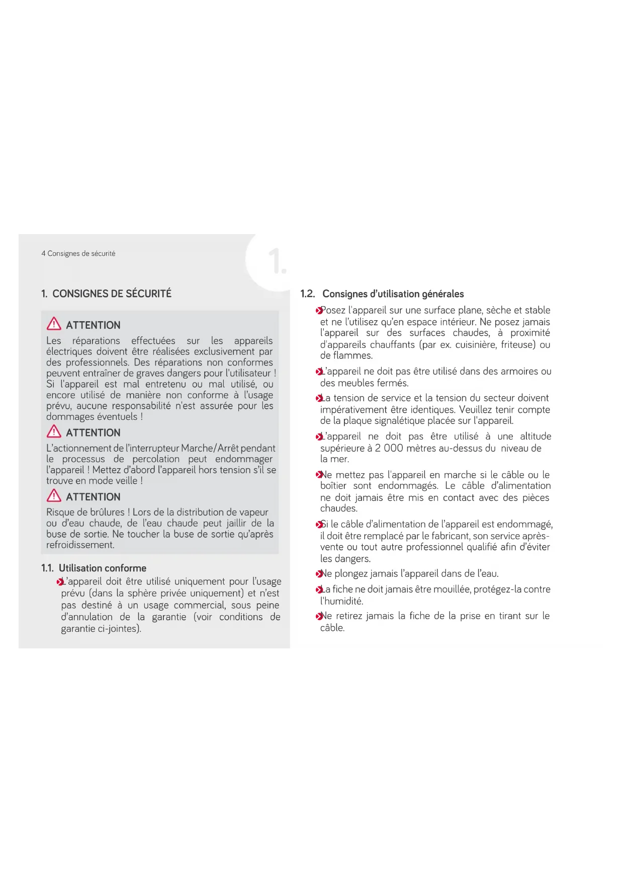 Ne retirez jamais la fiche de la prise en tirant sur le câble. ATTENTION Les réparations effectuées sur les appareils électriques doivent être réalisées exclusivement par des professionnels. Des réparations non conformes peuvent entraîner de graves dangers pour l'utilisateur! Si l'appareil est mal entretenu ou mal utilisé, ou encore utilisé de manière non conforme à l’usage prévu, aucune responsabilité n'est assurée pour les dommages éventuels! ATTENTION L’actionnement de l’interrupteur Marche/Arrêt pendant le processus de percolation peut endommager l’appareil! Mettez d’abord l’appareil hors tension s’il se trouve en mode veille! ATTENTION Risque de brûlures! Lors de la distribution de vapeur ou d’eau chaude, de l’eau chaude peut jaillir de la buse de sortie. Ne toucher la buse de sortie qu’après refroidissement.5Consignes de sécurité