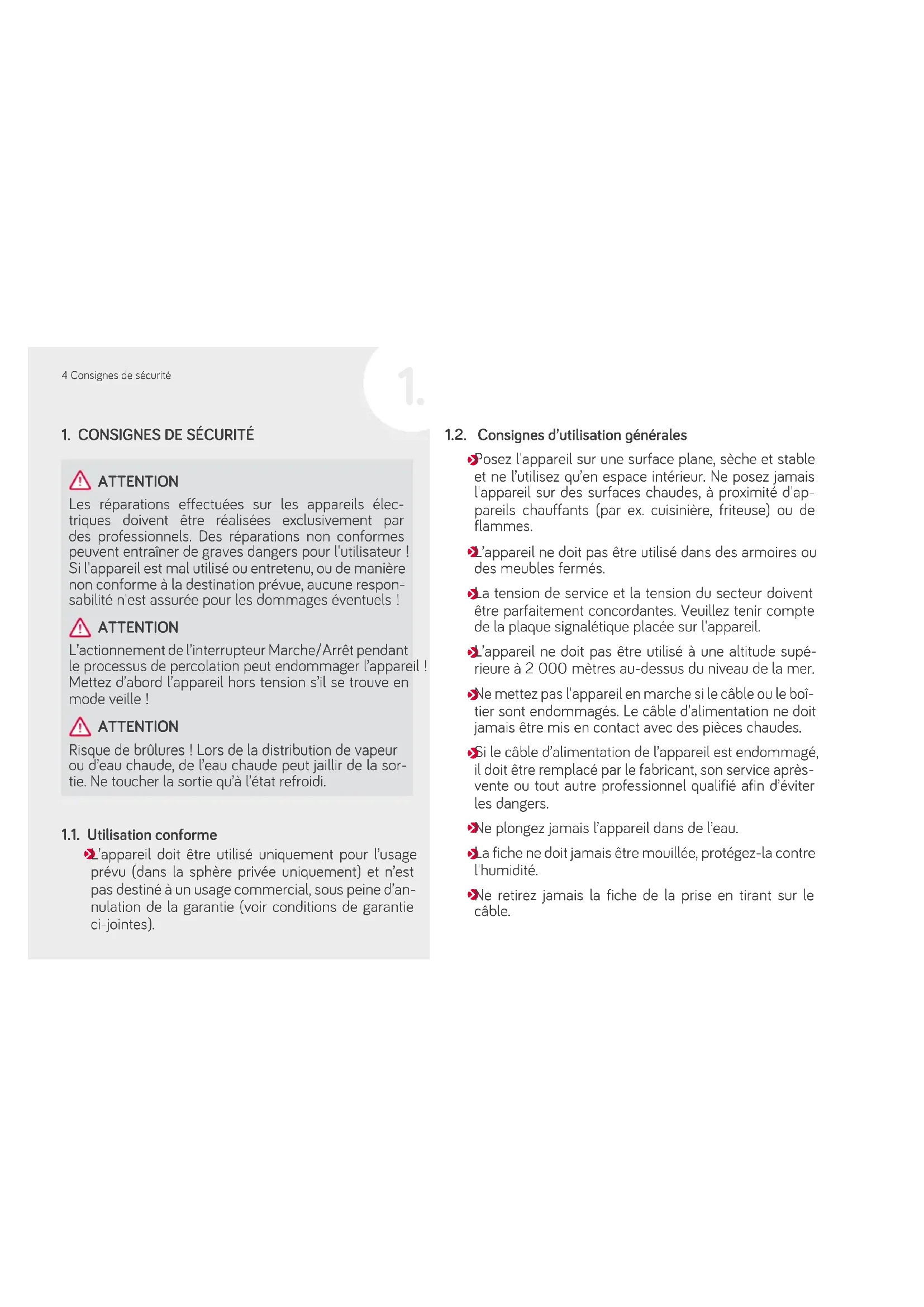 Ne retirez jamais la fiche de la prise en tirant sur le câble. ATTENTION Les réparations effectuées sur les appareils élec- triques doivent être réalisées exclusivement par des professionnels. Des réparations non conformes peuvent entraîner de graves dangers pour l'utilisateur! Si l'appareil est mal utilisé ou entretenu, ou de manière non conforme à la destination prévue, aucune respon- sabilité n'est assurée pour les dommages éventuels! ATTENTION L’actionnement de l’interrupteur Marche/Arrêt pendant le processus de percolation peut endommager l’appareil! Mettez d’abord l’appareil hors tension s’il se trouve en mode veille! ATTENTION Risque de brûlures! Lors de la distribution de vapeur ou d’eau chaude, de l’eau chaude peut jaillir de la sor- tie. Ne toucher la sortie qu’à l’état refroidi.5Consignes de sécurité