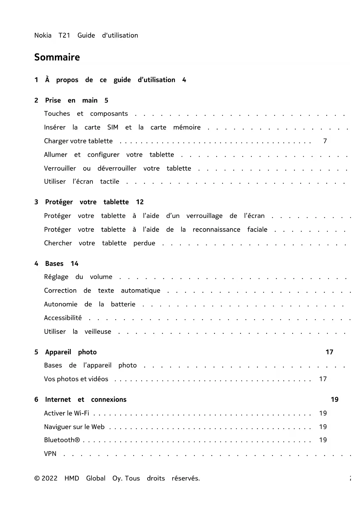 - Copyrights et autres avis ©2022 HMD Global Oy. Tous droits réservés. 3Nokia T21 Guide d'utilisation 1 À propos de ce guide d’utilisation Important: Pour obtenir des informations importantes sur l’utilisation sûre de votre appareil et de la batterie, consultez «Pour votre sécurité» et «Sécurité du produit» dans le guide d’utilisation imprimé ou sur www.nokia.com/support avant d’utiliser l’appareil. Pour découvrir comment prendre en main votre nouvel appareil, consultez le guide d’utilisation imprimé. ©2022 HMD Global Oy. Tous droits réservés. 4Nokia T21 Guide d'utilisation 2 Prise en main p. 37