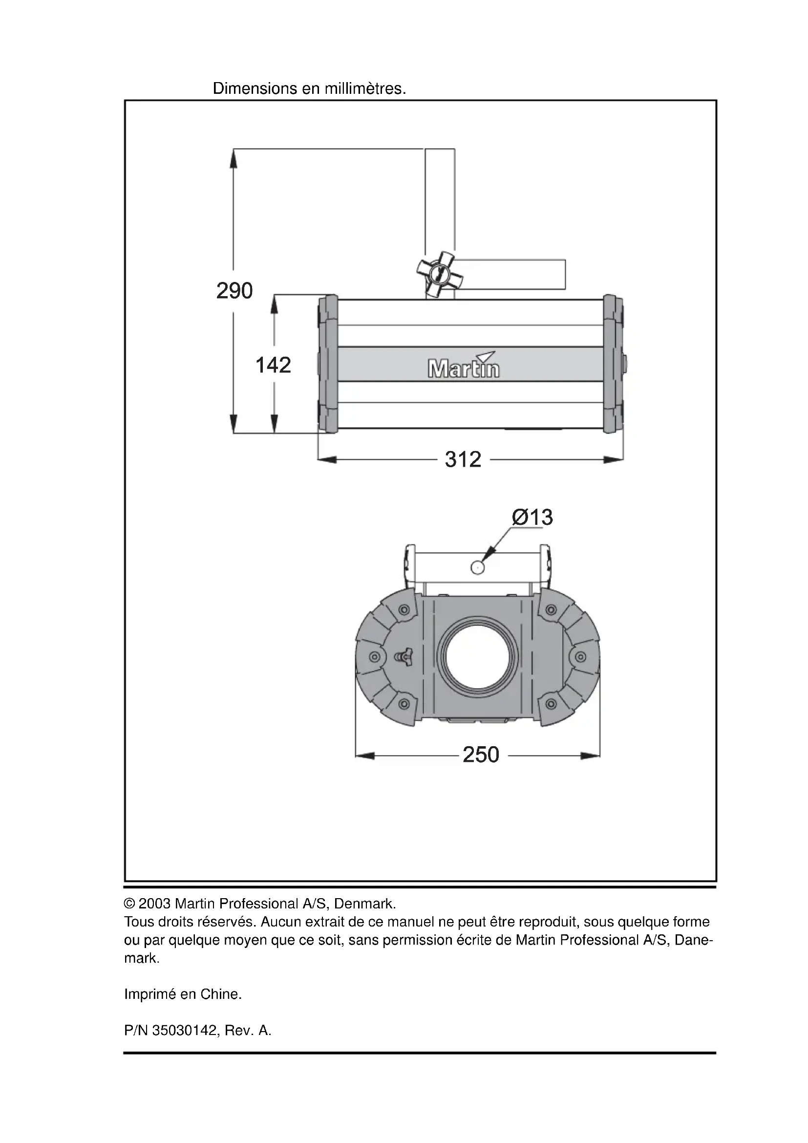 - Ø13 © 2003 Martin Professional A/S, Denmark. Tous droits réservés. Aucun extrait de ce manuel ne peut être reproduit, sous quelque forme ou par quelque moyen que ce soit, sans permission écrite de Martin Professional A/S, Dane- mark. Imprimé en Chine. P/N 35030142, Rev. A.3 Introduction p. 4