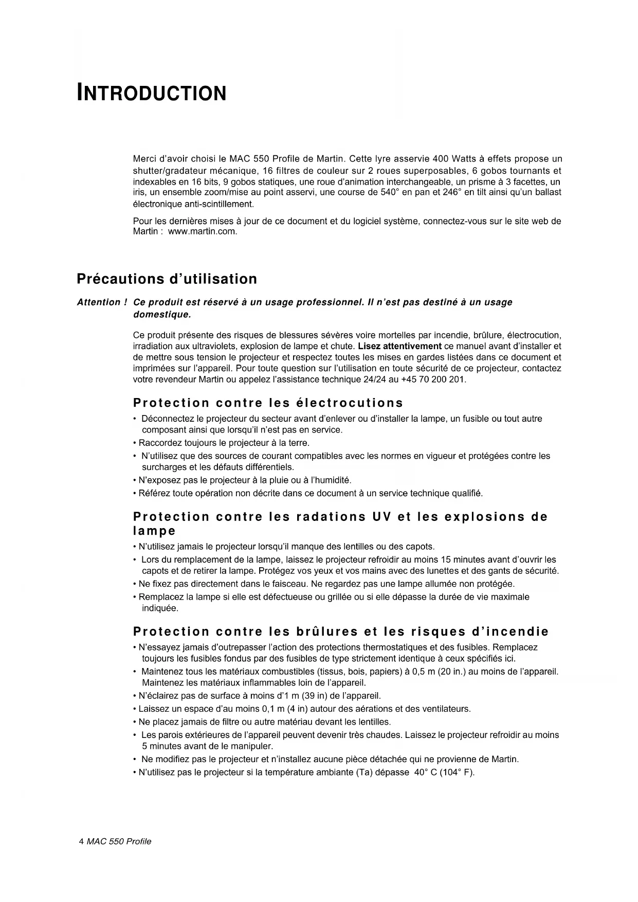 NTRODUCTION Merci d’avoir choisi le MAC 550 Profile de Martin. Cette lyre asservie 400 Watts à effets propose un shutter/gradateur mécanique, 16 filtres de couleur sur 2 roues superposables, 6 gobos tournants et indexables en 16 bits, 9 gobos statiques, une roue d’animation interchangeable, un prisme à 3 facettes, un iris, un ensemble zoom/mise au point asservi, une course de 540° en pan et 246° en tilt ainsi qu’un ballast électronique anti-scintillement. Pour les dernières mises à jour de ce document et du logiciel système, connectez-vous sur le site web de Martin : www.martin.com. Précautions d’utilisation Attention ! Ce produit est réservé à un usage professionnel. Il n’est pas destiné à un usage domestique. Ce produit présente des risques de blessures sévères voire mortelles par incendie, brûlure, électrocution, irradiation aux ultraviolets, explosion de lampe et chute. Lisez attentivement ce manuel avant d’installer et de mettre sous tension le projecteur et respectez toutes les mises en gardes listées dans ce document et imprimées sur l’appareil. Pour toute question sur l’utilisation en toute sécurité de ce projecteur, contactez votre revendeur Martin ou appelez l’assistance technique 24/24 au +45 70 200 201. Protection contre les électrocutions