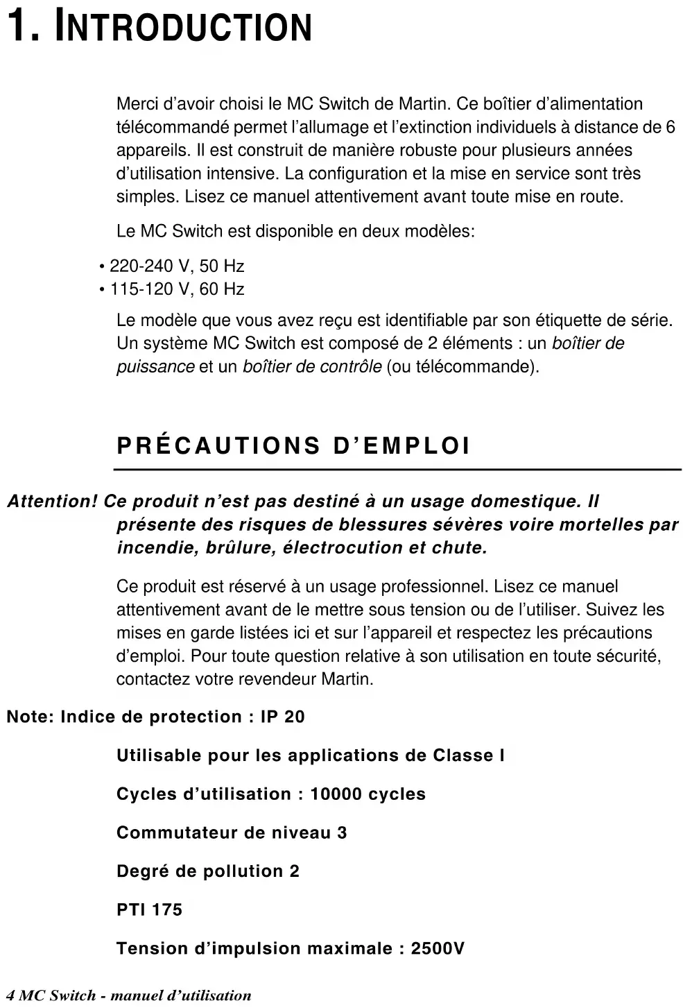 Attention! Ce produit n’est pas destiné à un usage domestique. Il présente des risques de blessures sévères voire mortelles par incendie, brûlure, électrocution et chute. Ce produit est réservé à un usage professionnel. Lisez ce manuel attentivement avant de le mettre sous tension ou de l’utiliser. Suivez les mises en garde listées ici et sur l’appareil et respectez les précautions d’emploi. Pour toute question relative à son utilisation en toute sécurité, contactez votre revendeur Martin. Note: Indice de protection : IP 20 Utilisable pour les applications de Classe I Cycles d’utilisation : 10000 cycles Commutateur de niveau 3 Degré de pollution 2 PTI 175 Tension d’impulsion maximale : 2500V1. Introduction 5 Protection contre les électrocutions
