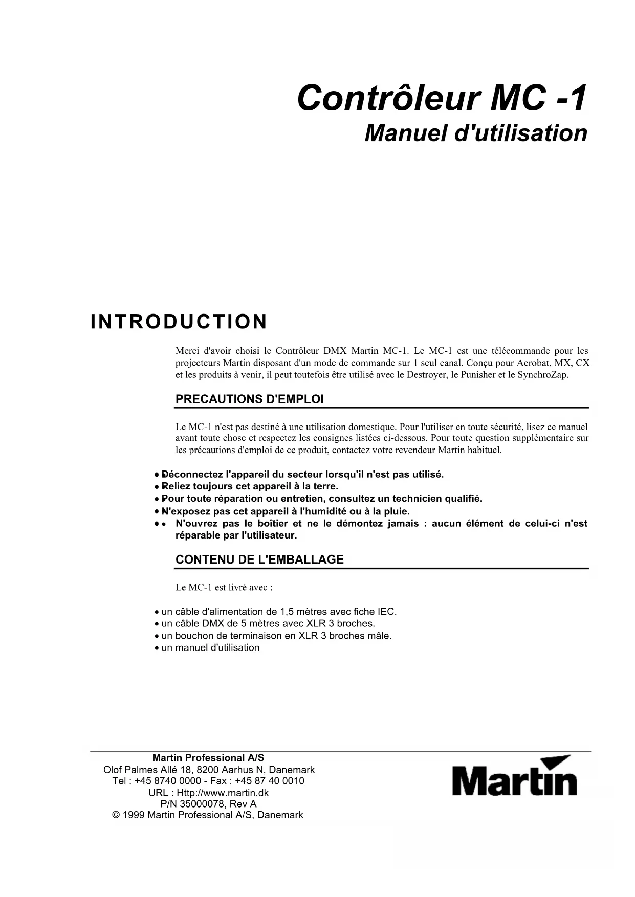 Martin Professional A/S Olof Palmes Allé 18, 8200 Aarhus N, Danemark Tel : +45 8740 0000 - Fax : +45 87 40 0010 URL : Http://www.martin.dk P/N 35000078, Rev A © 1999 Martin Professional A/S, Danemark Contrôleur MC -1 Manuel d'utilisation INTRODUCTION Merci d'avoir choisi le Contrôleur DMX Martin MC-1. Le MC-1 est une télécommande pour les projecteurs Martin disposant d'un mode de commande sur 1 seul canal. Conçu pour Acrobat, MX, CX et les produits à venir, il peut toutefois être utilisé avec le Destroyer, le Punisher et le SynchroZap. PRECAUTIONS D'EMPLOI Le MC-1 n'est pas destiné à une utilisation domestique. Pour l'utiliser en toute sécurité, lisez ce manuel avant toute chose et respectez les consignes listées ci-dessous. Pour toute question supplémentaire sur les précautions d'emploi de ce produit, contactez votre revendeur Martin habituel.