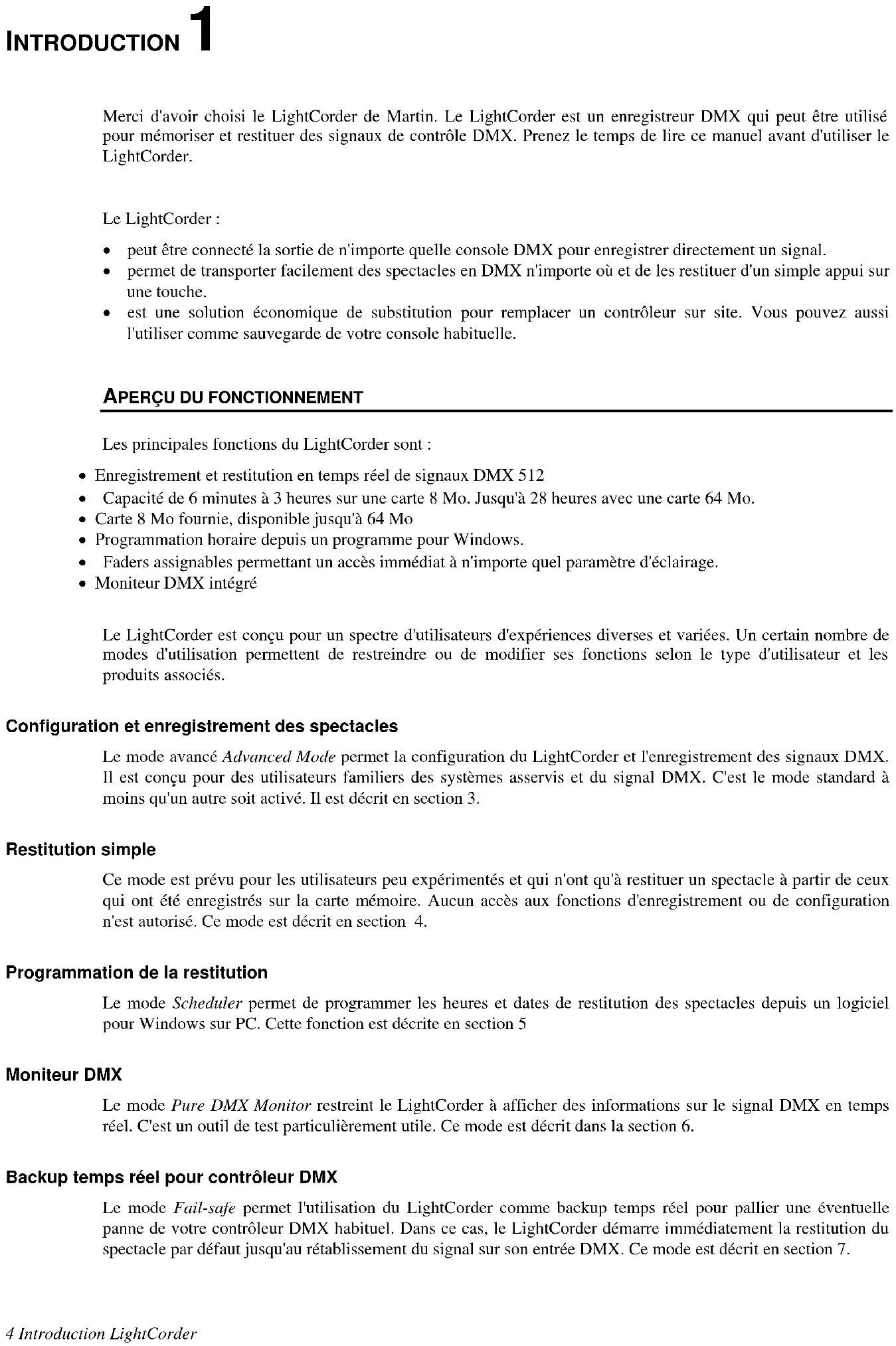 Merci d'avoir besoin du LightCorder de Martin. Le LightCorder est un enregistreur DMX qui peut être utilisé pour memoriser et restituer des signaux de contrôle DMX. Prenez le temps de lire ce manuel avant d'utiliser le LightCorder.