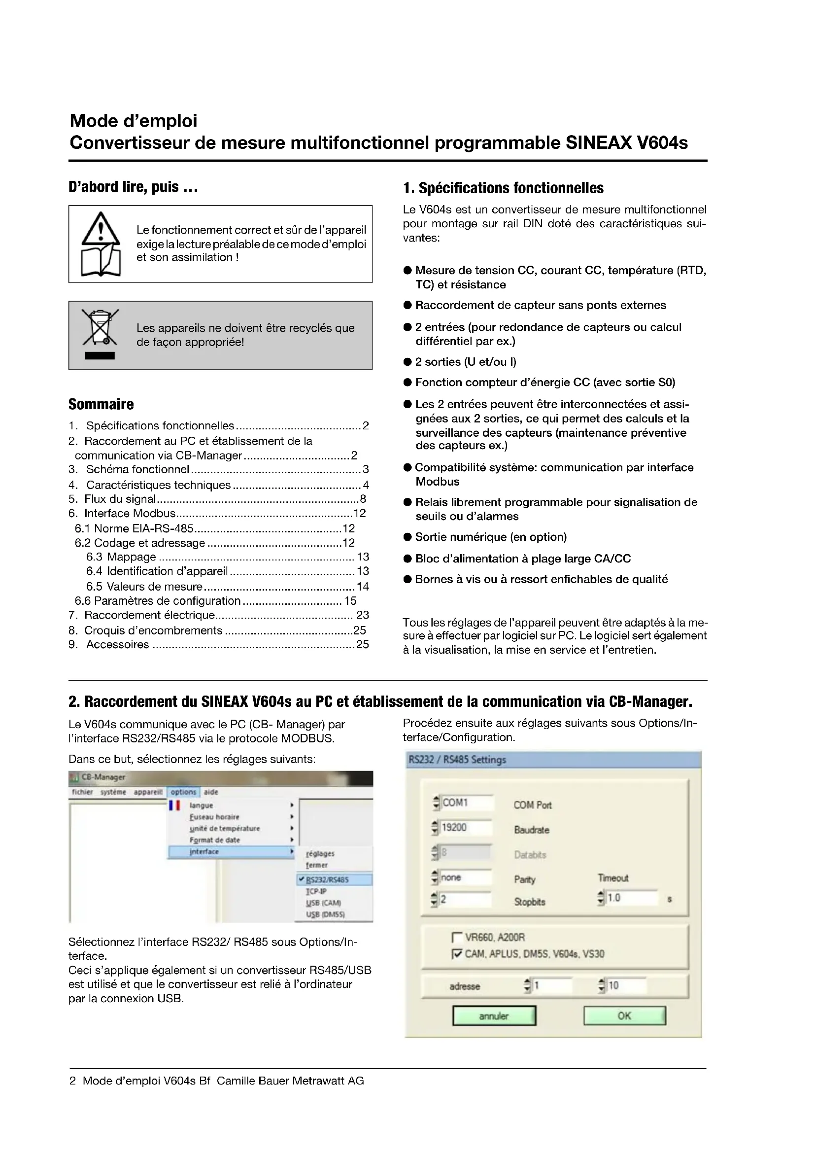 Mode d’emploi SINEAX V604s Convertisseur de mesure multifonctionnel programmable Camille Bauer Metrawatt AG Aargauerstrasse 7 CH-5610 Wohlen/Switzerland Téléphone +41 56 618 21 11 Télécopie +41 56 618 21 21 info@camillebauer.com www.camillebauer.com2 Mode d’emploi V604s Bf Camille Bauer Metrawatt AG Mode d’emploi Convertisseur de mesure multifonctionnel programmable SINEAX V604s D’abord lire, puis … Le fonctionnement correct et sûr de l’appareil exige la lecture préalable de ce mode d’emploi et son assimilation! Les appareils ne doivent être recyclés que de façon appropriée! Sommaire