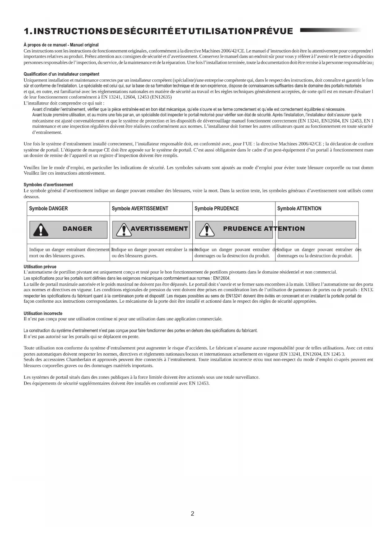 - 14. DÉCLARATION DE CONFORMITÉ À propos de ce manuel - Manuel original Ces instructions sont les instructions de fonctionnement originales, conformément à la directive Machines 2006/42/CE. Le manuel d’instruction doit être lu attentivement pour comprendre les informations importantes relatives au produit. Prêtez attention aux consignes de sécurité et d’avertissement. Conservez le manuel dans un endroit sûr pour vous y référer à l’avenir et le mettre à disposition à toutes les personnes responsables de l’inspection, du service, de la maintenance et de la réparation. Une fois l’installation terminée, toute la documentation doit être remise à la personne responsable/au propriétaire. Qualication d’un installateur compétent Uniquement installation et maintenance correctes par un installateur compétent (spécialiste)/une entreprise compétente qui, dans le respect des instructions, doit connaître et garantir le fonctionnement sûr et conforme de l’installation. Le spécialiste est celui qui, sur la base de sa formation technique et de son expérience, dispose de connaissances sufsantes dans le domaine des portails motorisés et qui, en outre, est familiarisé avec les réglementations nationales en matière de sécurité au travail et les règles techniques généralement acceptées, de sorte qu'il est en mesure d'évaluer la sécurité de leur fonctionnement conformément à EN 13241, 12604, 12453 (EN12635) L’installateur doit comprendre ce qui suit : Avant d’installer l’entraînement, vérier que la pièce entraînée est en bon état mécanique, qu’elle s’ouvre et se ferme correctement et qu’elle est correctement équilibrée si nécessaire. Avant toute première utilisation, et au moins une fois par an, un spécialiste doit inspecter le portail motorisé pour vérier son état de sécurité. Après l’installation, l’installateur doit s’assurer que le mécanisme est ajusté convenablement et que le système de protection et les dispositifs de déverrouillage manuel fonctionnent correctement (EN 13241, EN12604, EN 12453, EN 12635). Une maintenance et une inspection régulières doivent être réalisées conformément aux normes. L’installateur doit former les autres utilisateurs quant au fonctionnement en toute sécurité du système d’entraînement. Une fois le système d’entraînement installé correctement, l’installateur responsable doit, en conformité avec, pour l’UE : la directive Machines 2006/42/CE ; la déclaration de conformité CE pour le système de portail. L’étiquette de marque CE doit être apposée sur le système de portail. C’est aussi obligatoire dans le cadre d’un post-équipement d’un portail à fonctionnement manuel. De plus, un dossier de remise de l’appareil et un registre d’inspection doivent être remplis. Veuillez lire le mode d’emploi, en particulier les indications de sécurité. Les symboles suivants sont ajoutés au mode d’emploi pour éviter toute blessure corporelle ou tout dommage matériel. Veuillez lire ces instructions attentivement. Symboles d’avertissement Le symbole général d’avertissement indique un danger pouvant entraîner des blessures, voire la mort. Dans la section texte, les symboles généraux d’avertissement sont utilisés comme décrit ci- dessous. Utilisation prévue L’automatisme de portillon pivotant est uniquement conçu et testé pour le bon fonctionnement de portillons pivotants dans le domaine résidentiel et non commercial. Les spécications pour les portails sont dénies dans les exigences mécaniques conformément aux normes : EN12604. La taille de portail maximale autorisée et le poids maximal ne doivent pas être dépassés. Le portail doit s’ouvrir et se fermer sans encombres à la main. Utilisez l’automatisme sur des portails conformes aux normes et directives en vigueur. Les conditions régionales de pression du vent doivent être prises en considération lors de l’utilisation de panneaux de portes ou de portails : EN13241. Veuillez respecter les spécications du fabricant quant à la combinaison porte et dispositif. Les risques possibles au sens de EN13241 doivent être évités en concevant et en installant la porte/le portail de façon conforme aux instructions correspondantes. Le mécanisme de la porte doit être installé et actionné dans le respect des règles de sécurité appropriées. Utilisation incorrecte Il n’est pas conçu pour une utilisation continue ni pour une utilisation dans une application commerciale. La construction du système d’entraînement n’est pas conçue pour faire fonctionner des portes en dehors des spécications du fabricant. Il n’est pas autorisé sur les portails qui se déplacent en pente. Toute utilisation non conforme du système d’entraînement peut augmenter le risque d’accidents. Le fabricant n’assume aucune responsabilité pour de telles utilisations. Avec cet entraînement, les portes automatiques doivent respecter les normes, directives et règlements nationaux/locaux et internationaux actuellement en vigueur (EN 13241, EN12604, EN 1245 3. Seuls des accessoires Chamberlain et approuvés peuvent être connectés à l’entraînement. Toute installation incorrecte et/ou tout non-respect du mode d’emploi ci-après peuvent entraîner des blessures corporelles graves ou des dommages matériels importants. Les systèmes de portail situés dans des zones publiques à la force limitée doivent être actionnés sous une totale surveillance. Des équipements de sécurité supplémentaires doivent être installés en conformité avec EN 12453. Symbole DANGER Symbole AVERTISSEMENT Symbole PRUDENCE Symbole ATTENTION DANGER AVERTISSEMENT PRUDENCE ATTENTION Indique un danger entraînant directement la mort ou des blessures graves. Indique un danger pouvant entraîner la mort ou des blessures graves. Indique un danger pouvant entraîner des dommages ou la destruction du produit. Indiqu