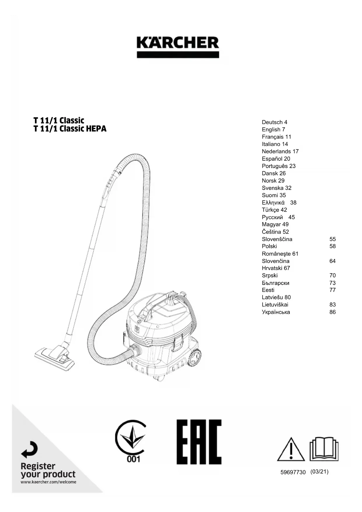 Retrouvez gratuitement la notice de l'appareil T 111 Classic HEPA Kärcher au format PDF.