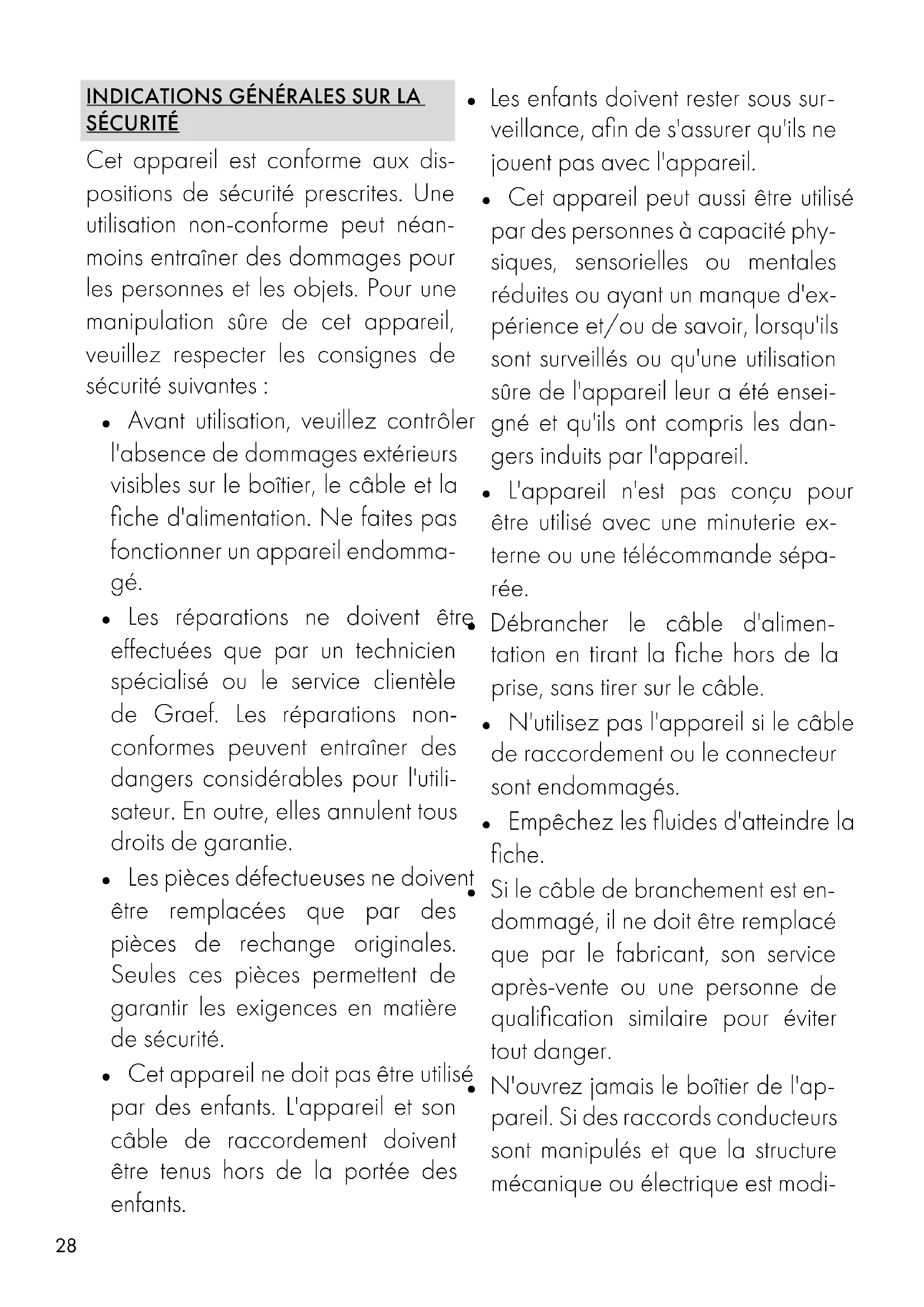 SÉCURITÉ Cet appareil est conforme aux dis- positions de sécurité prescrites. Une utilisation non-conforme peut néan- moins entraîner des dommages pour les personnes et les objets. Pour une manipulation sûre de cet appareil, veuillez respecter les consignes de sécurité suivantes: ● Avant utilisation, veuillez contrôler l'absence de dommages extérieurs visibles sur le boîtier, le câble et la fiche d'alimentation. Ne faites pas fonctionner un appareil endomma- gé. ● Les réparations ne doivent être effectuées que par un technicien spécialisé ou le service clientèle de Graef. Les réparations non- conformes peuvent entraîner des dangers considérables pour l'utili- sateur. En outre, elles annulent tous droits de garantie. ● Les pièces défectueuses ne doivent être remplacées que par des pièces de rechange originales. Seules ces pièces permettent de garantir les exigences en matière de sécurité. ● Cet appareil ne doit pas être utilisé par des enfants. L'appareil et son câble de raccordement doivent être tenus hors de la portée des enfants. ● Les enfants doivent rester sous sur- veillance, afin de s'assurer qu'ils ne jouent pas avec l'appareil. ● Cet appareil peut aussi être utilisé par des personnes à capacité phy- siques, sensorielles ou mentales réduites ou ayant un manque d'ex- périence et/ou de savoir, lorsqu'ils sont surveillés ou qu'une utilisation sûre de l'appareil leur a été ensei- gné et qu'ils ont compris les dan- gers induits par l'appareil. ● L'appareil n'est pas conçu pour être utilisé avec une minuterie ex- terne ou une télécommande sépa- rée. ● Débrancher le câble d'alimen- tation en tirant la fiche hors de la prise, sans tirer sur le câble. ● N'utilisez pas l'appareil si le câble de raccordement ou le connecteur sont endommagés. ● Empêchez les fluides d'atteindre la fiche. ● Si le câble de branchement est en- dommagé, il ne doit être remplacé que par le fabricant, son service après-vente ou une personne de qualification similaire pour éviter tout danger. ● N'ouvrez jamais le boîtier de l'ap- pareil. Si des raccords conducteurs sont manipulés et que la structure mécanique ou électrique est modi-29