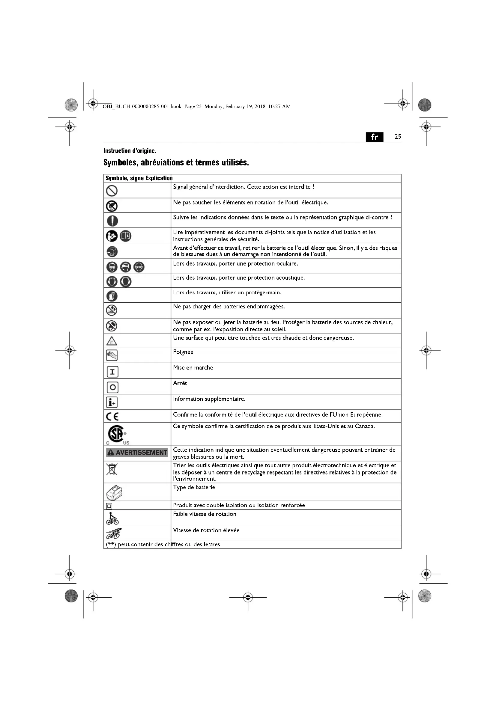 Instruction d’origine. Symboles, abréviations et termes utilisés. Symbole, signe Explication Signal général d’interdiction. Cette action est interdite ! Ne pas toucher les éléments en rotation de l’outil électrique. Suivre les indications données dans le texte ou la représentation graphique ci-contre ! Lire impérativement les documents ci-joints tels que la notice d’utilisation et les instructions générales de sécurité. Avant d’effectuer ce travail, retirer la batterie de l’outil électrique. Sinon, il y a des risques de blessures dues à un démarrage non intentionné de l’outil. Lors des travaux, porter une protection oculaire. Lors des travaux, porter une protection acoustique. Lors des travaux, utiliser un protège-main. Ne pas charger des batteries endommagées. Ne pas exposer ou jeter la batterie au feu. Protéger la batterie des sources de chaleur, comme par ex. l’exposition directe au soleil. Une surface qui peut être touchée est très chaude et donc dangereuse. Poignée Mise en marche Arrêt Information supplémentaire. Confirme la conformité de l’outil électrique aux directives de l’Union Européenne. Ce symbole confirme la certification de ce produit aux Etats-Unis et au Canada. Cette indication indique une situation éventuellement dangereuse pouvant entraîner de graves blessures ou la mort. Trier les outils électriques ainsi que tout autre produit électrotechnique et électrique et les déposer à un centre de recyclage respectant les directives relatives à la protection de l’environnement. Type de batterie Produit avec double isolation ou isolation renforcée Faible vitesse de rotation Vitesse de rotation élevée (**) peut contenir des chiffres ou des lettres AVERTISSEMENT OBJ_BUCH-0000000285-001.book Page 25 Monday, February 19, 2018 10:27 AM26