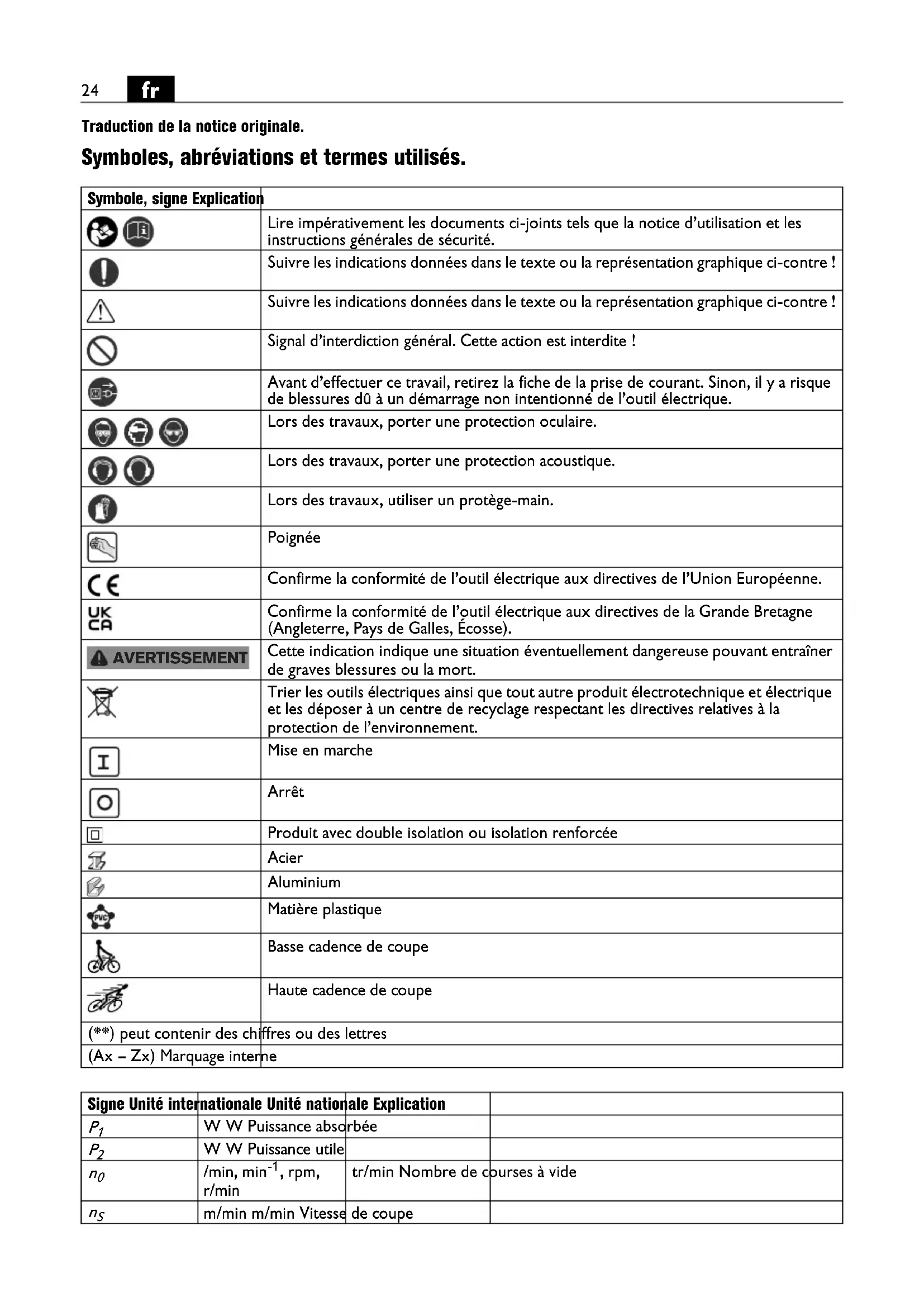 Traduction de la notice originale. Symboles, abréviations et termes utilisés. Symbole, signe Explication Lire impérativement les documents ci-joints tels que la notice d’utilisation et les instructions générales de sécurité. Suivre les indications données dans le texte ou la représentation graphique ci-contre ! Suivre les indications données dans le texte ou la représentation graphique ci-contre ! Signal d’interdiction général. Cette action est interdite ! Avant d’effectuer ce travail, retirez la fiche de la prise de courant. Sinon, il y a risque de blessures dû à un démarrage non intentionné de l’outil électrique. Lors des travaux, porter une protection oculaire. Lors des travaux, porter une protection acoustique. Lors des travaux, utiliser un protège-main. Poignée Confirme la conformité de l’outil électrique aux directives de l’Union Européenne. Confirme la conformité de l’outil électrique aux directives de la Grande Bretagne (Angleterre, Pays de Galles, Écosse). Cette indication indique une situation éventuellement dangereuse pouvant entraîner de graves blessures ou la mort. Trier les outils électriques ainsi que tout autre produit électrotechnique et électrique et les déposer à un centre de recyclage respectant les directives relatives à la protection de l’environnement. Mise en marche Arrêt Produit avec double isolation ou isolation renforcée Acier Aluminium Matière plastique Basse cadence de coupe Haute cadence de coupe (**) peut contenir des chiffres ou des lettres (Ax – Zx) Marquage interne AVERTISSEMENT Signe Unité internationale Unité nationale Explication