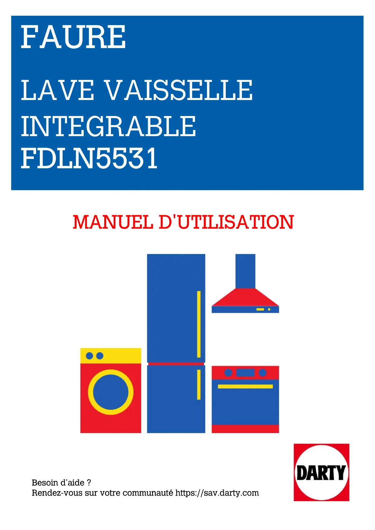 PROLINE REFRIGERATEUR BRF40 LAVE VAISSELLE INTEGRABLE FDLN5531 FAURE MANUEL D'UTILISATION Besoin d'aide ?Rendez-vous sur votre communauté https://sav.darty.comGETTING STARTED? EASY. User Manual FDLN5531 FR Notice d'utilisation Lave-vaisselleINFORMATIONS DE SÉCURITÉ Avant d'installer et d'utiliser cet appareil, lisez soigneusement les instructions fournies. Le fabricant ne pourra être tenu pour responsable des blessures et dégâts résultant d'une mauvaise installation ou utilisation. Conservez toujours les instructions dans un lieu sûr et accessible pour vous y référer ultérieurement. SÉCURITÉ DES ENFANTS ET DES PERSONNES VULNÉRABLES.