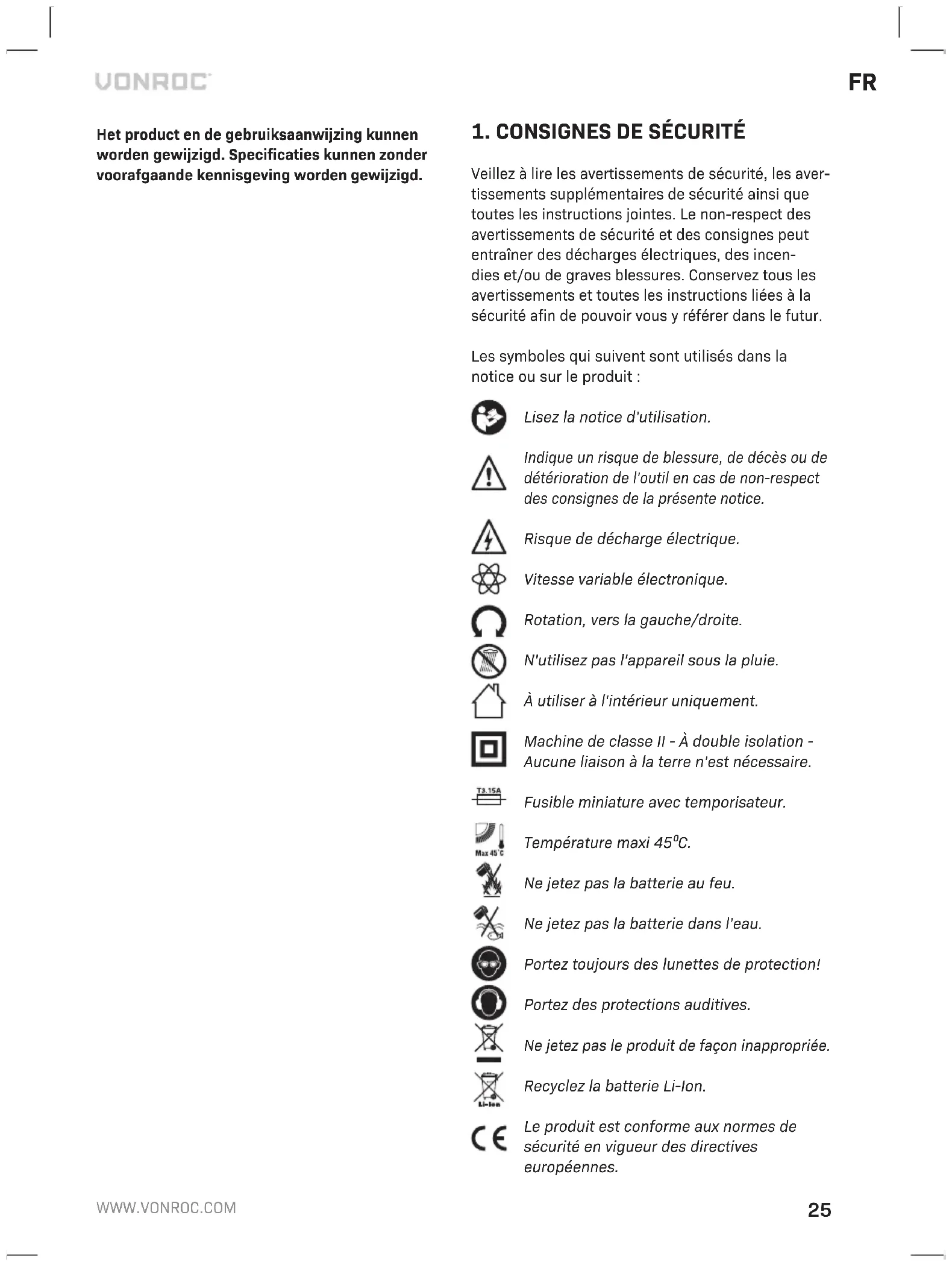 ENVIRONNEMENT Les appareils électriques et électroniques défectueux ou en fin de vie doivent être rapportés dans des sites de recyclage appropriés. Pour les pays de la Communauté Européenne uniquement Ne jetez pas les outils électriques avec les déchets ménagers. Conformément à la Directive Euro- péenne 2012/19/CE relative à l'élimination des déchets électriques et électroniques et sa trans- position dans la législation nationale, les outils électriques inutilisables doivent être collectés séparément et être jetés de façon écologique. GARANTIE Les produits VONROC sont développés avec les normes de qualité les plus hautes et ils sont garantis pour être exempts de défaut de pièces et de main d'œuvre pour la durée stipulée par la loi et à compter de la date d'achat initiale. Si, au cours de cette période, le produit devait rencontrer une quelconque panne due à un défaut de pièce ou de main d'œuvre, contactez VONROC directement. Les conditions suivantes sont exclues de la garantie :