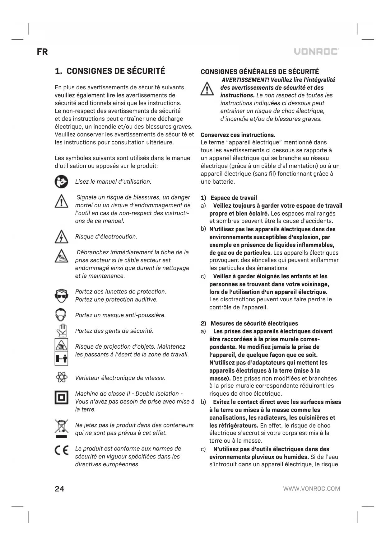 En plus des avertissements de sécurité suivants, veuillez également lire les avertissements de sécurité additionnels ainsi que les instructions. Le non-respect des avertissements de sécurité et des instructions peut entraîner une décharge électrique, un incendie et/ou des blessures graves. Veuillez conserver les avertissements de sécurité et les instructions pour consultation ultérieure. Les symboles suivants sont utilisés dans le manuel d’utilisation ou apposés sur le produit: Lisez le manuel d’utilisation. Signale un risque de blessures, un danger mortel ou un risque d’endommagement de l’outil en cas de non-respect des instructi- ons de ce manuel. Risque d’électrocution. Débranchez immédiatement la fiche de la prise secteur si le câble secteur est endommagé ainsi que durant le nettoyage et la maintenance. Portez des lunettes de protection. Portez une protection auditive. Portez un masque anti-poussière. Portez des gants de sécurité. Risque de projection d’objets. Maintenez les passants à l’écart de la zone de travail. Variateur électronique de vitesse. Machine de classe II - Double isolation - Vous n’avez pas besoin de prise avec mise à la terre. Ne jetez pas le produit dans des conteneurs qui ne sont pas prévus à cet effet. Le produit est conforme aux normes de sécurité en vigueur spécifiées dans les directives européennes. CONSIGNES GÉNÉRALES DE SÉCURITÉ AVERTISSEMENT! Veuillez lire l’intégralité des avertissements de sécurité et des instructions. Le non respect de toutes les instructions indiquées ci dessous peut entraîner un risque de choc électrique, d’incendie et/ou de blessures graves. Conservez ces instructions. Le terme “appareil électrique” mentionné dans tous les avertissements ci dessous se rapporte à un appareil électrique qui se branche au réseau électrique (grâce à un câble d’alimentation) ou à un appareil électrique (sans fil) fonctionnant grâce à une batterie.