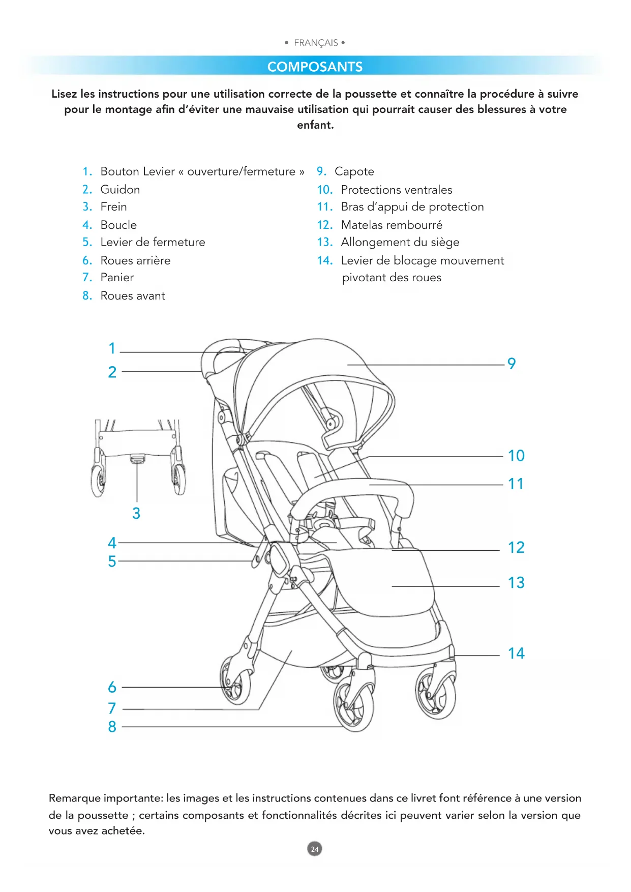pivotant des roues Remarque importante: les images et les instructions contenues dans ce livret font référence à une version de la poussette ; certains composants et fonctionnalités décrites ici peuvent varier selon la version que vous avez achetée. Lisez les instructions pour une utilisation correcte de la poussette et connaître la procédure à suivre pour le montage an d’éviter une mauvaise utilisation qui pourrait causer des blessures à votre enfant.