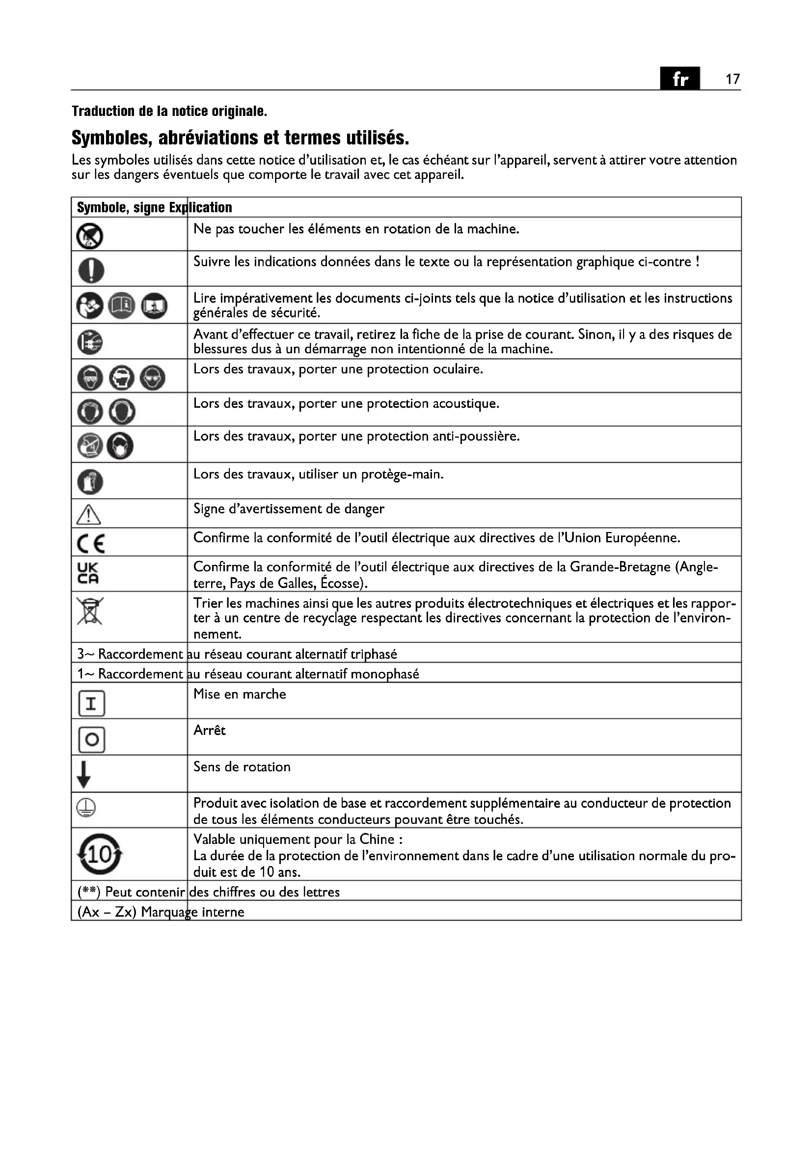 Traduction de la notice originale. Symboles, abréviations et termes utilisés. Les symboles utilisés dans cette notice d’utilisation et, le cas échéant sur l’appareil, servent à attirer votre attention sur les dangers éventuels que comporte le travail avec cet appareil. Symbole, signe Explication Ne pas toucher les éléments en rotation de la machine. Suivre les indications données dans le texte ou la représentation graphique ci-contre ! Lire impérativement les documents ci-joints tels que la notice d’utilisation et les instructions générales de sécurité. Avant d’effectuer ce travail, retirez la fiche de la prise de courant. Sinon, il y a des risques de blessures dus à un démarrage non intentionné de la machine. Lors des travaux, porter une protection oculaire. Lors des travaux, porter une protection acoustique. Lors des travaux, porter une protection anti-poussière. Lors des travaux, utiliser un protège-main. Signe d’avertissement de danger Confirme la conformité de l’outil électrique aux directives de l’Union Européenne. Confirme la conformité de l’outil électrique aux directives de la Grande-Bretagne (Angle- terre, Pays de Galles, Écosse). Trier les machines ainsi que les autres produits électrotechniques et électriques et les rappor- ter à un centre de recyclage respectant les directives concernant la protection de l’environ- nement. 3~ Raccordement au réseau courant alternatif triphasé 1~ Raccordement au réseau courant alternatif monophasé Mise en marche Arrêt Sens de rotation Produit avec isolation de base et raccordement supplémentaire au conducteur de protection de tous les éléments conducteurs pouvant être touchés. Valable uniquement pour la Chine : La durée de la protection de l’environnement dans le cadre d’une utilisation normale du pro- duit est de 10 ans. (**) Peut contenir des chiffres ou des lettres (Ax – Zx) Marquage interne18