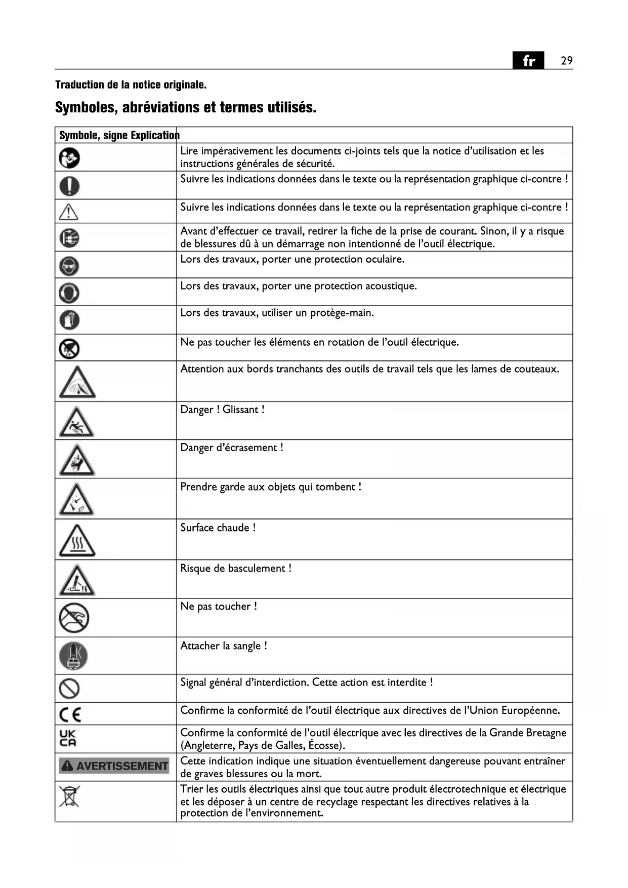 Traduction de la notice originale. Symboles, abréviations et termes utilisés. Symbole, signe Explication Lire impérativement les documents ci-joints tels que la notice d’utilisation et les instructions générales de sécurité. Suivre les indications données dans le texte ou la représentation graphique ci-contre ! Suivre les indications données dans le texte ou la représentation graphique ci-contre ! Avant d’effectuer ce travail, retirer la fiche de la prise de courant. Sinon, il y a risque de blessures dû à un démarrage non intentionné de l’outil électrique. Lors des travaux, porter une protection oculaire. Lors des travaux, porter une protection acoustique. Lors des travaux, utiliser un protège-main. Ne pas toucher les éléments en rotation de l’outil électrique. Attention aux bords tranchants des outils de travail tels que les lames de couteaux. Danger ! Glissant ! Danger d’écrasement ! Prendre garde aux objets qui tombent ! Surface chaude ! Risque de basculement ! Ne pas toucher ! Attacher la sangle ! Signal général d’interdiction. Cette action est interdite ! Confirme la conformité de l’outil électrique aux directives de l’Union Européenne. Confirme la conformité de l’outil électrique avec les directives de la Grande Bretagne (Angleterre, Pays de Galles, Écosse). Cette indication indique une situation éventuellement dangereuse pouvant entraîner de graves blessures ou la mort. Trier les outils électriques ainsi que tout autre produit électrotechnique et électrique et les déposer à un centre de recyclage respectant les directives relatives à la protection de l’environnement. AVERTISSEMENT30