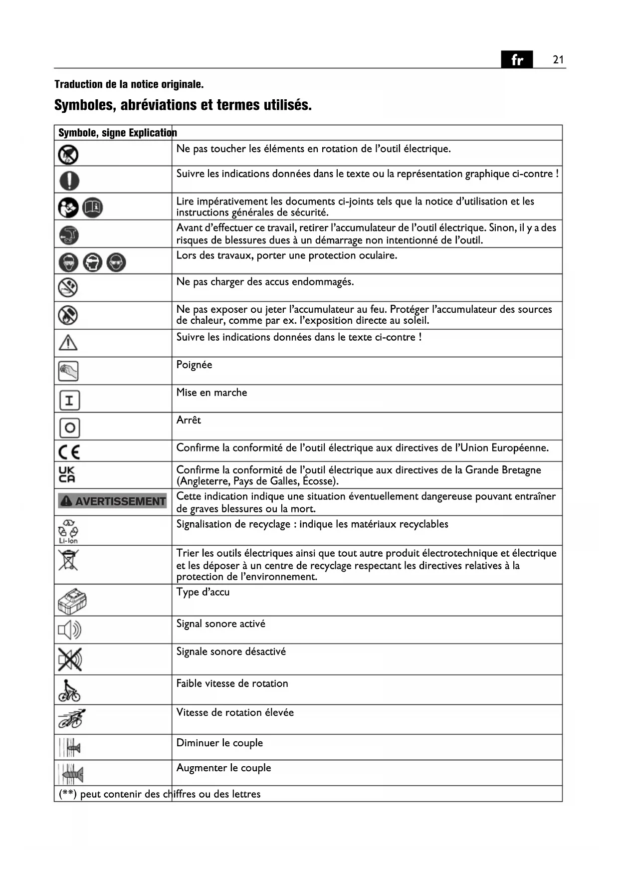 Traduction de la notice originale. Symboles, abréviations et termes utilisés. Symbole, signe Explication Ne pas toucher les éléments en rotation de l’outil électrique. Suivre les indications données dans le texte ou la représentation graphique ci-contre ! Lire impérativement les documents ci-joints tels que la notice d’utilisation et les instructions générales de sécurité. Avant d’effectuer ce travail, retirer l’accumulateur de l’outil électrique. Sinon, il y a des risques de blessures dues à un démarrage non intentionné de l’outil. Lors des travaux, porter une protection oculaire. Ne pas charger des accus endommagés. Ne pas exposer ou jeter l’accumulateur au feu. Protéger l’accumulateur des sources de chaleur, comme par ex. l’exposition directe au soleil. Suivre les indications données dans le texte ci-contre ! Poignée Mise en marche Arrêt Confirme la conformité de l’outil électrique aux directives de l’Union Européenne. Confirme la conformité de l’outil électrique aux directives de la Grande Bretagne (Angleterre, Pays de Galles, Écosse). Cette indication indique une situation éventuellement dangereuse pouvant entraîner de graves blessures ou la mort. Signalisation de recyclage : indique les matériaux recyclables Trier les outils électriques ainsi que tout autre produit électrotechnique et électrique et les déposer à un centre de recyclage respectant les directives relatives à la protection de l’environnement. Type d’accu Signal sonore activé Signale sonore désactivé Faible vitesse de rotation Vitesse de rotation élevée Diminuer le couple Augmenter le couple (**) peut contenir des chiffres ou des lettres AVERTISSEMENT22